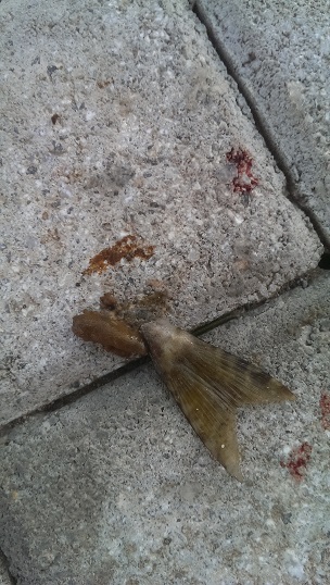 Докладываю: лисица рыбу не ест — понюхала, прикусила и бросила. А вот кот старый сожрал две с удовольствием, оставил только хвост и пузырь. Умелец! Приходит теперь каждый день, ждёт рыбку.