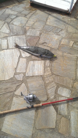 Штормило, но пошёл спин помочить. Поклёвок почти не было, думал осьминог, а вытянул фугу. Маленькая, но ядовитая. Морская рыбалка полна сюрпризов.