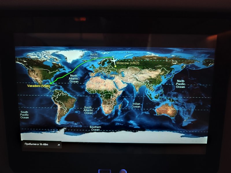 Самолёт огромный, летит быстро. Маршрут длиннее, чем через Канаду, но по времени столько же. Главное — впереди океан. :)