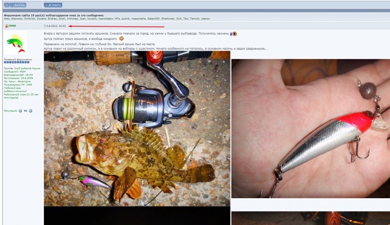 Решил вспомнить 2012-й — ловлю ерша на воблер, подвешенный к ушастику. Воблера любые, хоть китайские, лишь бы не тонули. Оснастка простая, игра приманки вторична. Ерш берёт жадно, иногда бьёт жаброй. Поклевки — звон в руку, как будто кто-то треснул по удилищу. Взял пару хвостатых красавцев и понял — способ рабочий, эмоций море. :-)