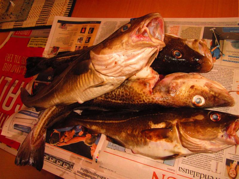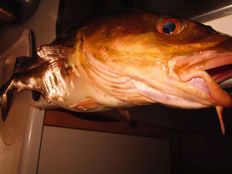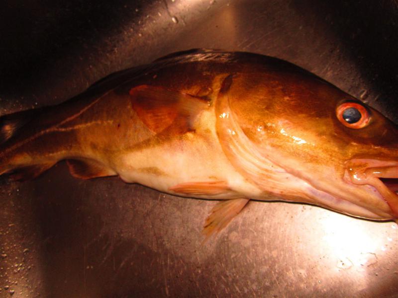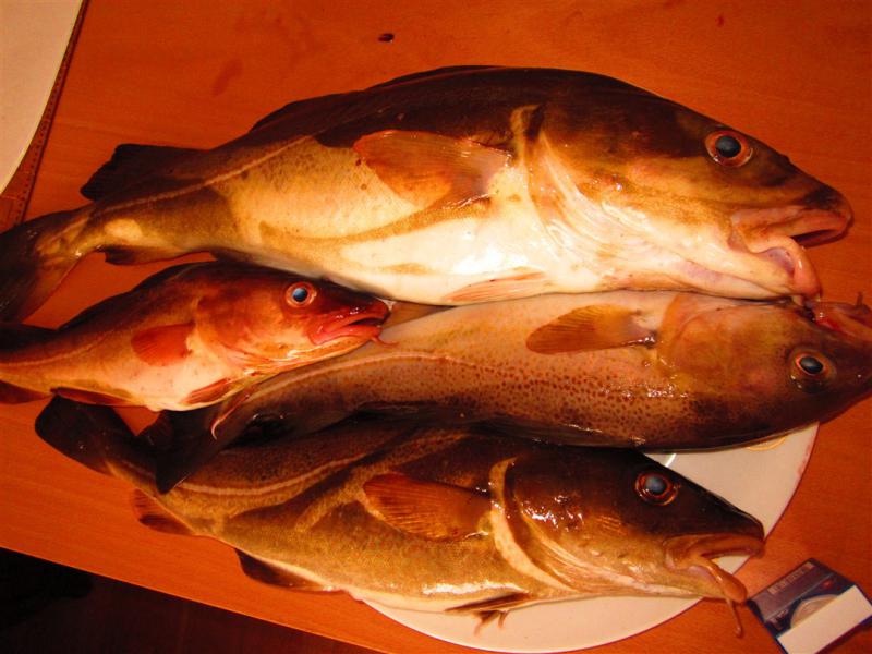 Треска попадается не всегда, чаще саида и пикша. Целенаправленно ловил пару раз, место подсказал старый рыбак — глубина, прилив. За два выхода по четыре трески, от 600 грамм до двух кил. Цвет рыбы бывает разный — серый или золотистый. После почищенной всё равно светится. :)