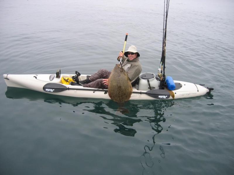 Каяки устойчивые, но встать в море всё же рискованно. На фото видно — шанс искупаться прямо пропорционален размеру палтуса. ))