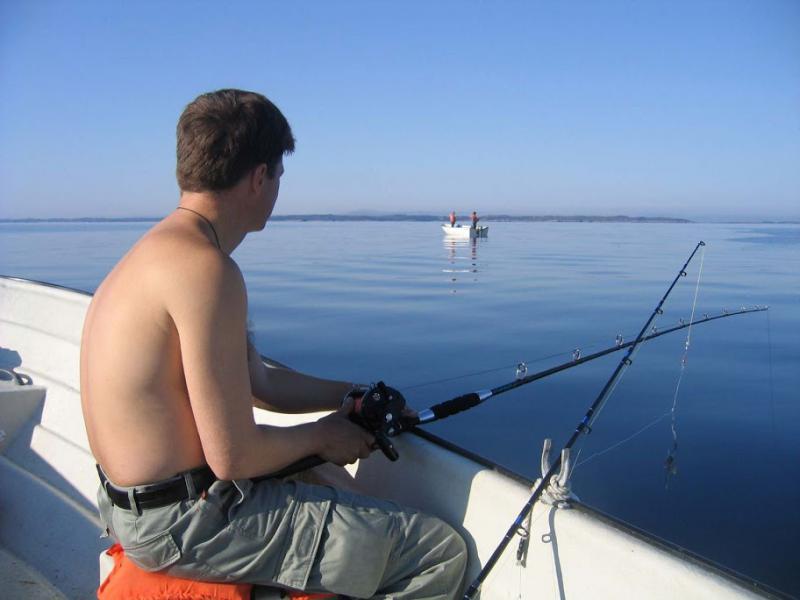 На Хитре в июле поплавок не обязателен — погода мягче, не зима. Но море коварное, поэтому спасжилет-воротник обязателен, а то и обычный жилет, их на базах хватает. На фото видно: штиль, солнце, но ветер с моря может налететь внезапно. Морская рыбалка на Хитре — удовольствие, но расслабляться нельзя.