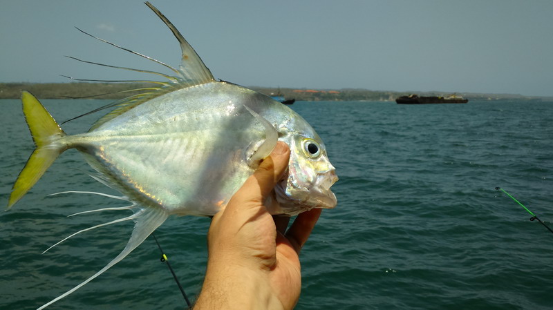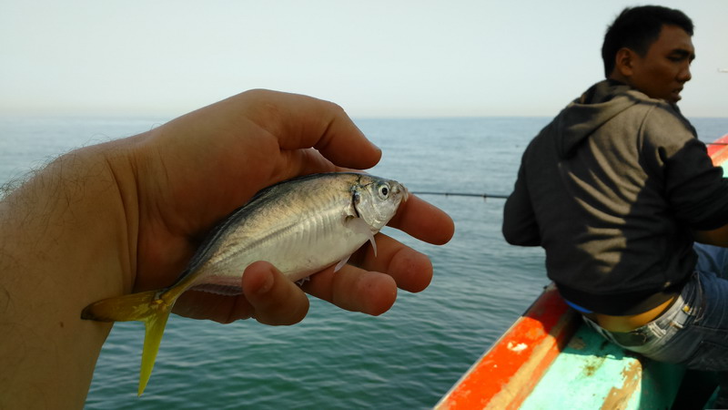 На второе утро в порту познакомился с рыбаком, предложил за 100 тыс. рупий на шхуну. Отплыли 3 км, рыбаки жарили рыбу, шутили. Атмосфера добрая, набили мешок мелочи, ставрида одна трофейная. Договорились завтра снова. Народ радушный, простые и весёлые.