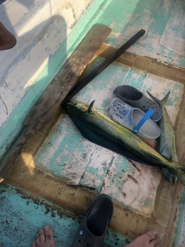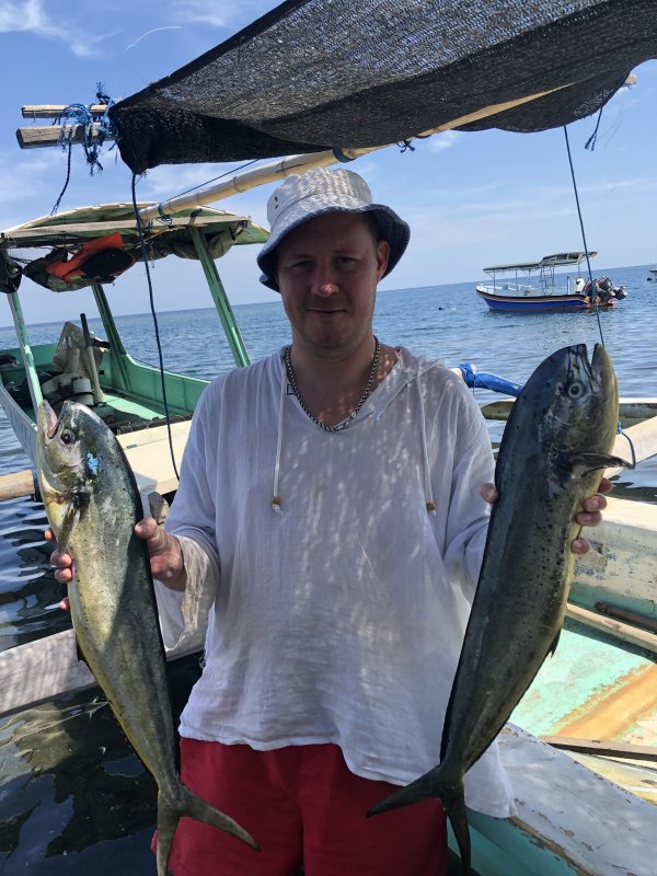 Немного потроллили, четыре махи поймали, туна сошла. Волна мягкая, погода отличная. Морская рыбалка на Бали радует, день короткий, но результат есть.