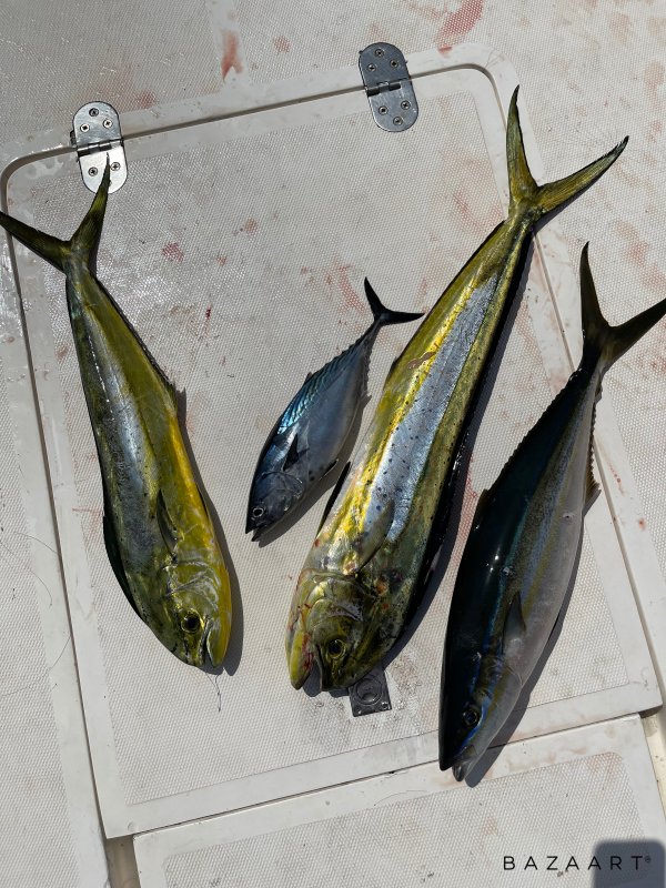 Старт 5:30, несколько точек пустые, на четвёртой живец дал радужника, позже девушки взяли двух махи, пока народ купался. На обратном пути бонито спасли суши и кляр из махи с тунцом — день вышел тёплый.