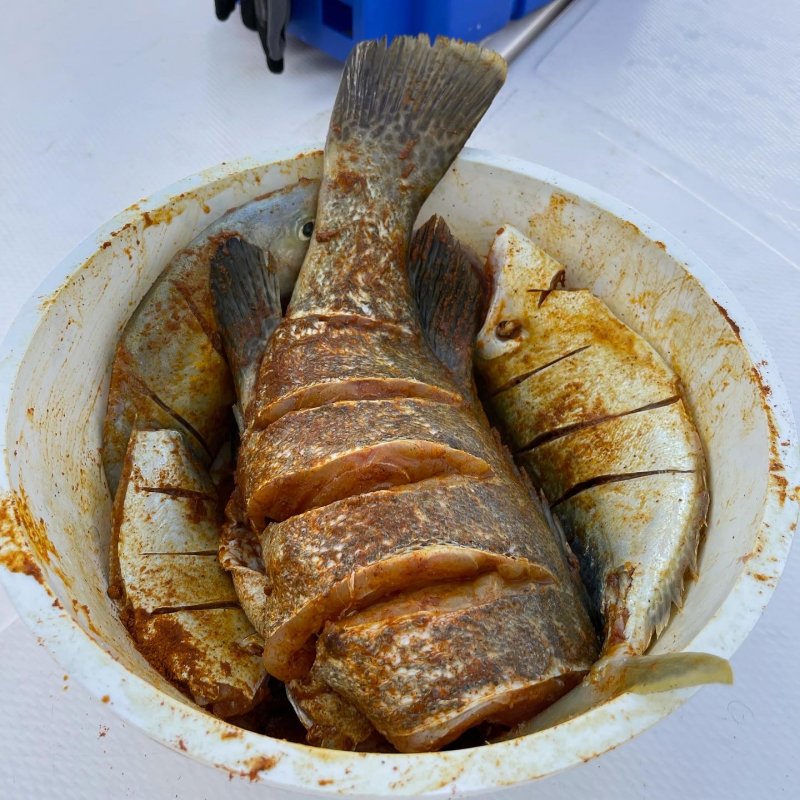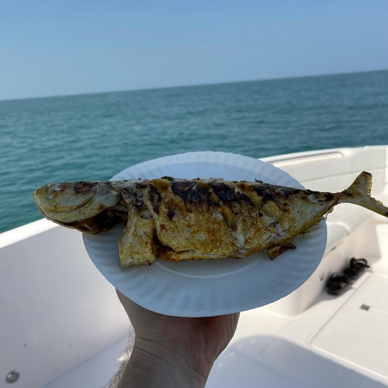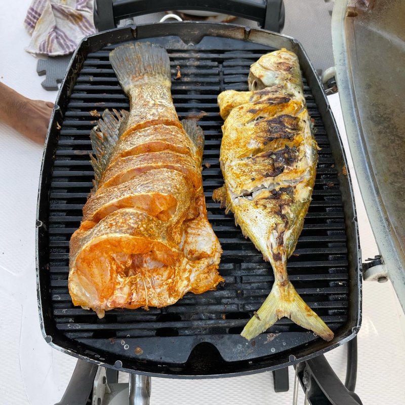 Прошли локацию с перепадами глубин 19–25 м, рано утром закрылись по живцу. Хамур шёл стабильно, пообедали прямо в лодке на гриле — свежак решает. Морская рыбалка как часть дня.