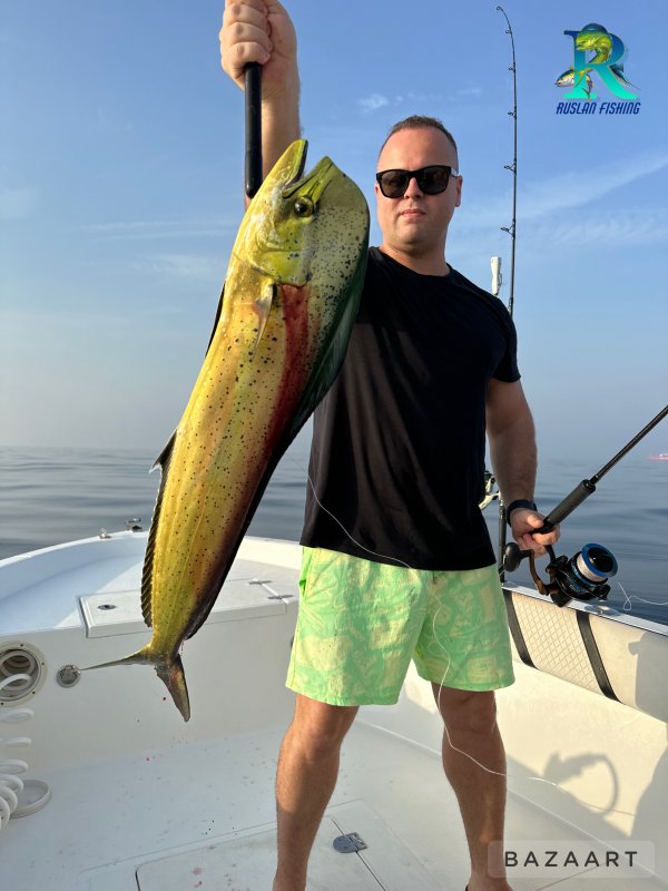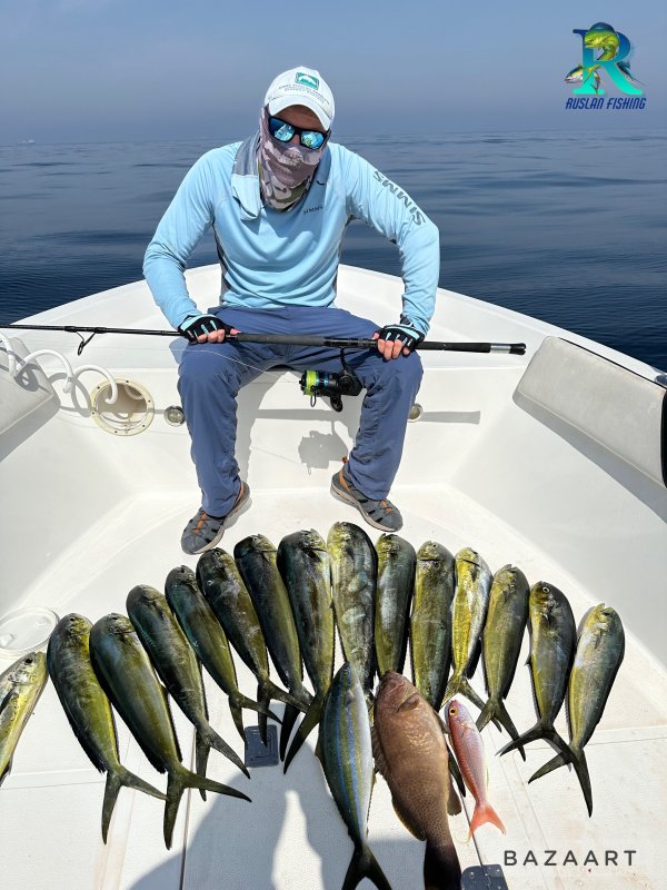 За неделю были два выезда: в Дубае стабильно трофейная барракуда на живца и квин в кастинг, во Фуджейре махи ест практически всё. Рыбу отдали в ресторан, поели по свежаку — морская рыбалка удалась.