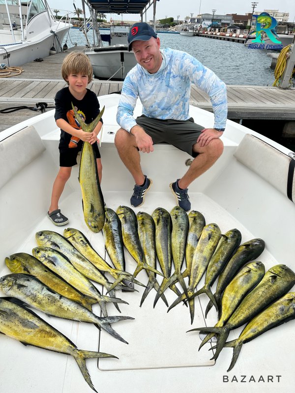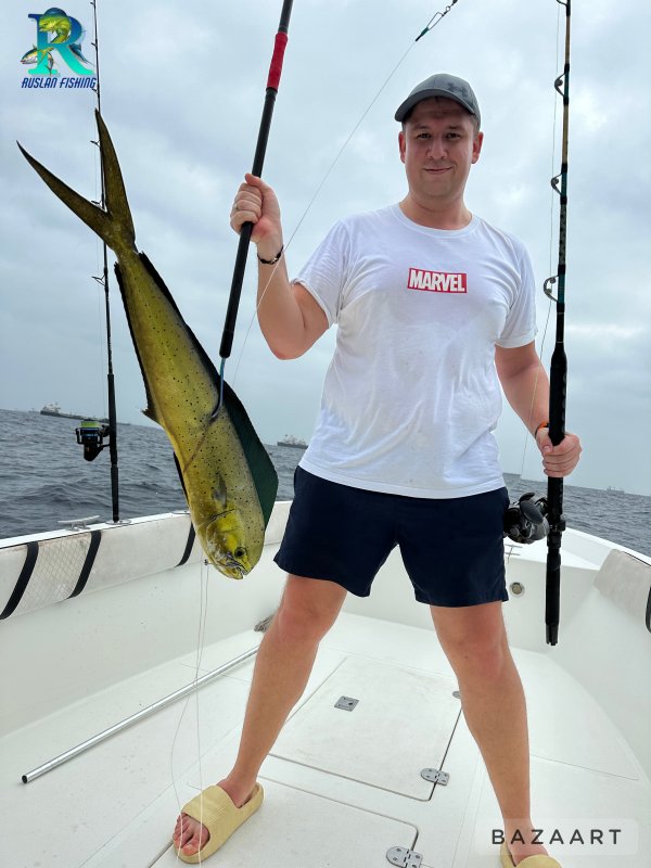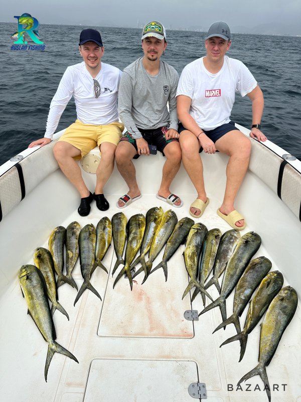 Открыли сезон по махи: рыба стояла близко, около 10 км. Волнa 1.5–2 м — пошли троллингом. Первый день 19, второй 18; в ресторане приготовили — под пиво зашло отлично.
