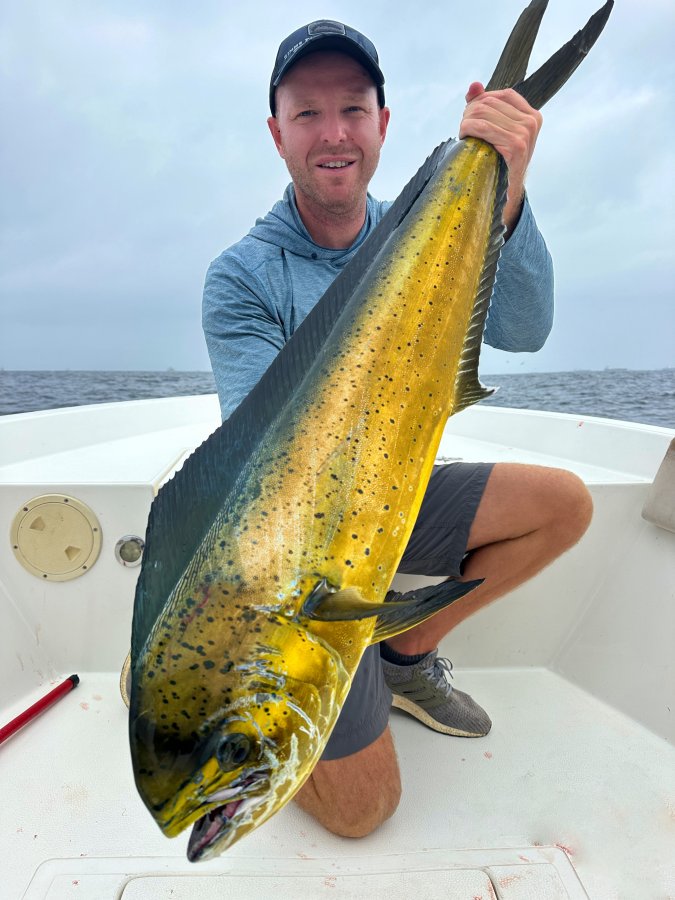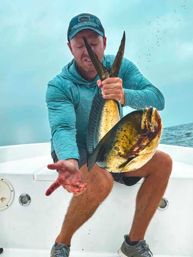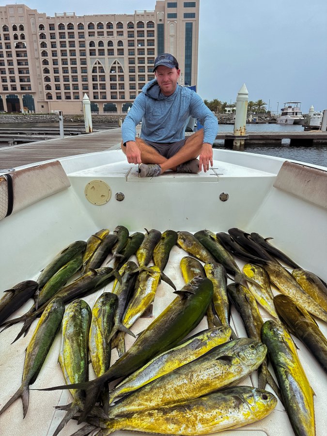 Вечером при выезде из Дубая было 40 °C, в 21:30 во Фуджейре 32 °C, утром 28 °C. По рыбе — такой активности махи ещё не помню: подходили к каждому кораблю, везде была. При желании за день можно было собрать сотню и больше. Мы забрали 32 штуки, чтобы показать, что сезон пошёл. Ловили в троллинг, при желании работал и кастинг, и джиг.