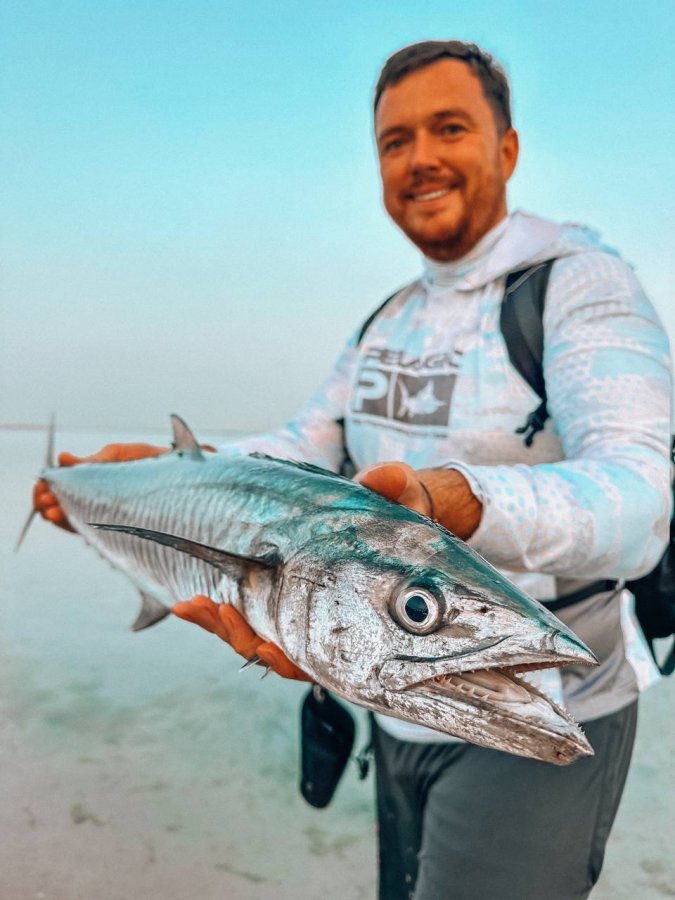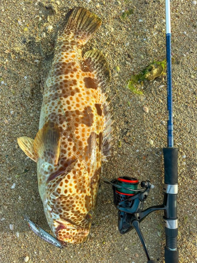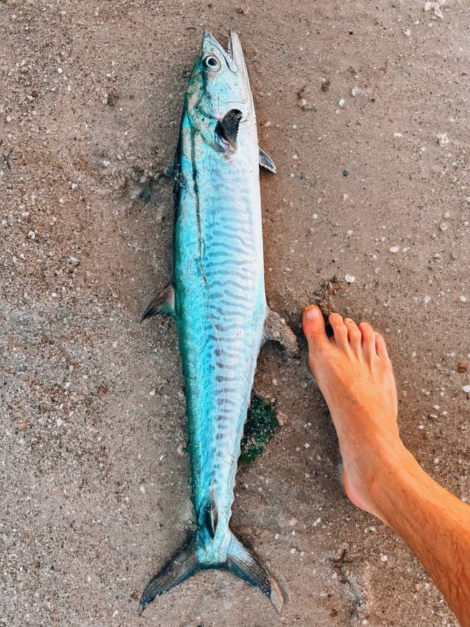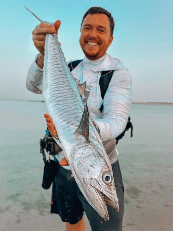 Прошли 6 км вдоль берега, бросали, меняли приманки и снова бросали. Сане зашёл кинг около 2 кг на 130-мм воблер, у меня два хамура на 110-мм и один сход. Утром было 28 °C, температура падает — рыба подходит ближе к берегу.