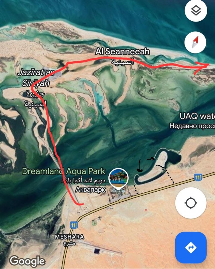 Мост ещё не достроен. Остров маленький, на карту ставлю путь пешком от асфальта. В другую сторону дорога выводит к аль-Хамра-Виладж с двумя огромными молами, там не гоняют, но идти далеко. Рельеф на карте лучше включать с тенями, иначе глубину не видно.