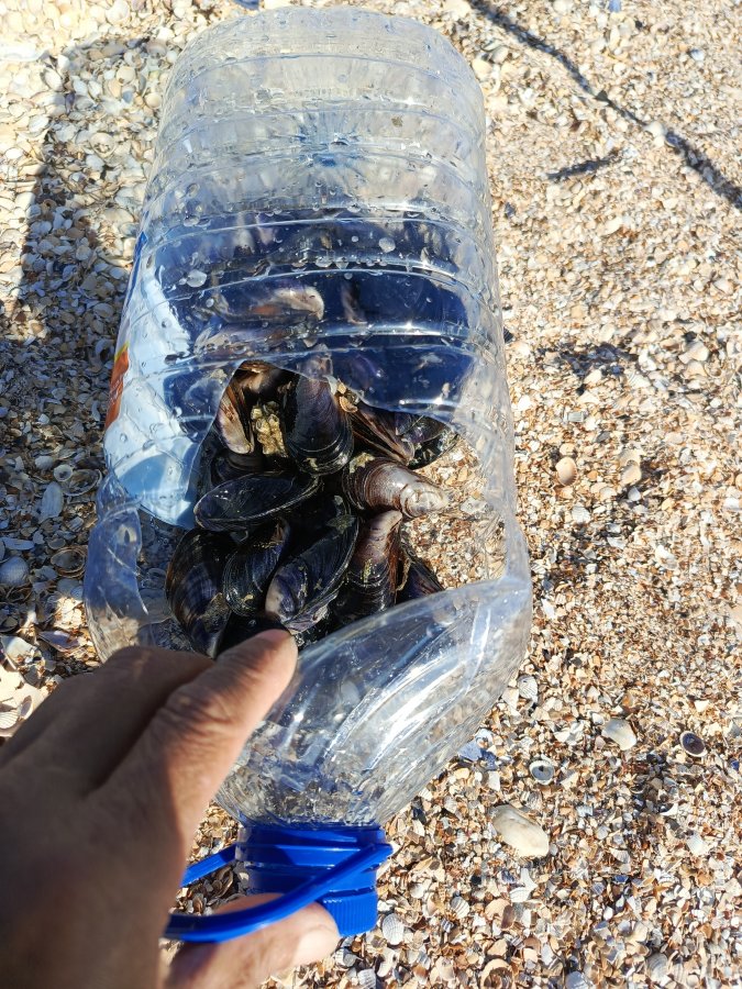 Пошли купаться и нашли, что дно усыпано мидиями под тонким слоем песка. Накопал лопаткой, вечером буду готовить — улов на кухне тоже радует.