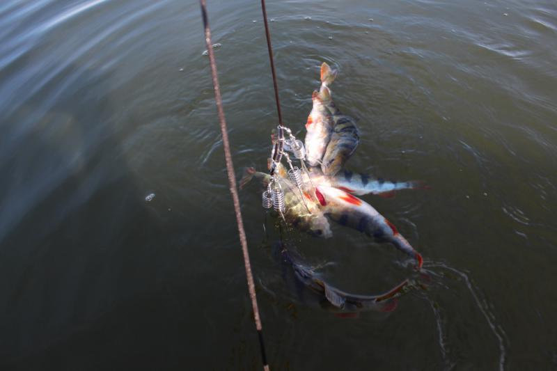 Подъём в 05:30, к 07:00 на воде штиль. Первый заброс - минус хвост твистера, второй - окунь 200-250, позже пара 350-400. За час собрали пятнашку. В желудке одного нашли кусок нашего же твистера. Уха вышла огонь, остальное пошло в засол.