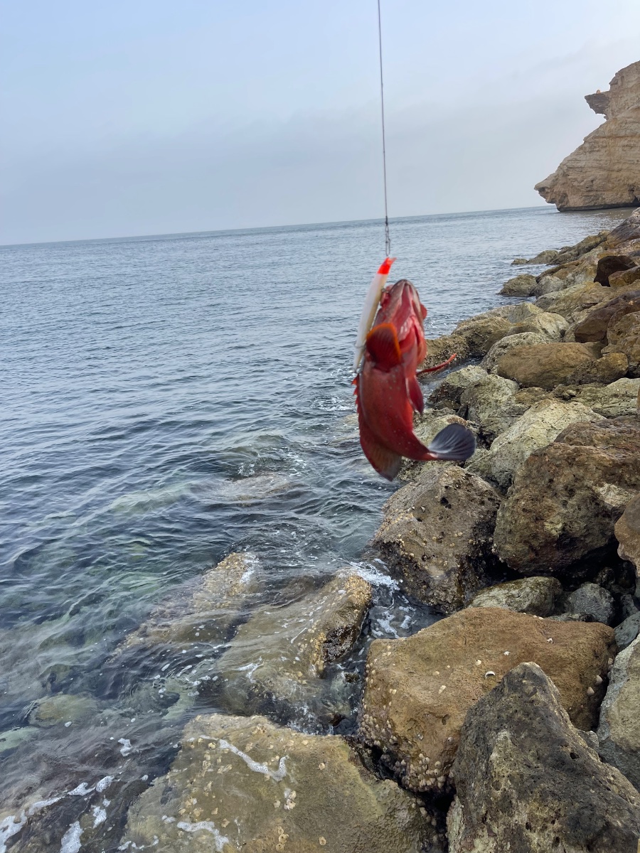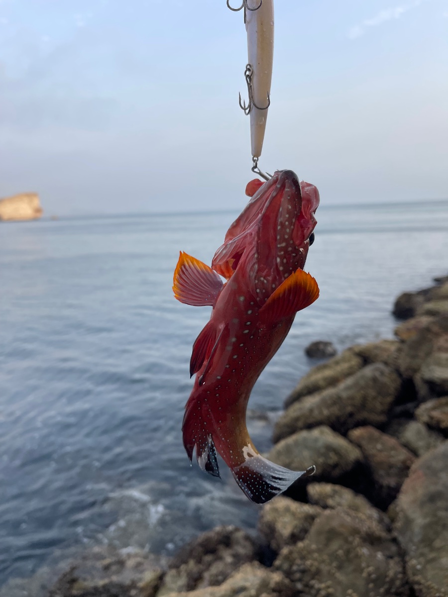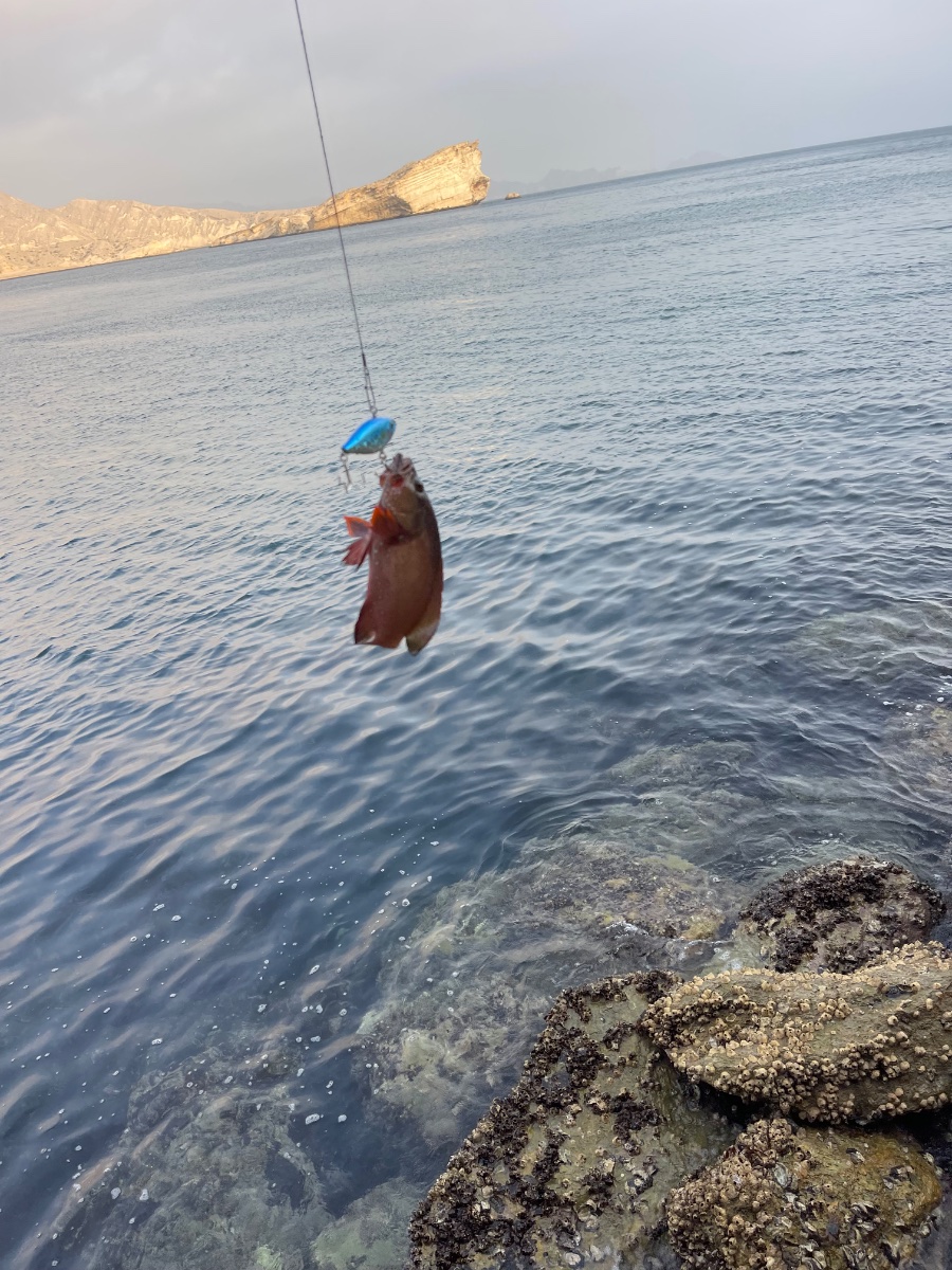 Ловил с камней у отеля Al Husn (18+), к 6 утра тише и без посторонних глаз. GPS 23.5539854, 58.6587226 записал в блокнот. В зачёте «мини» барракуда, «флейта» и пара тёмных окунёвых, на Megabass 125 и синий Daiwa виб клевало стабильно. За час десяток и ещё куча контактов, морская рыбалка на берегу вполне живая.
