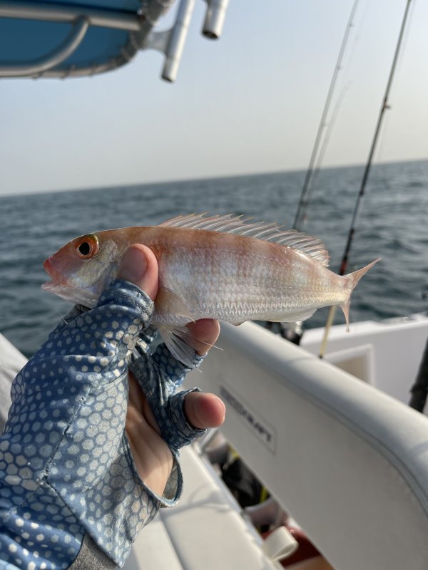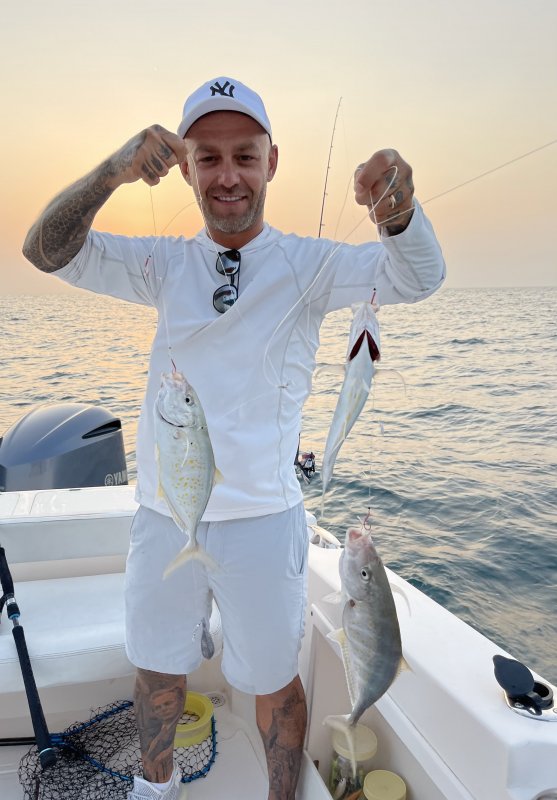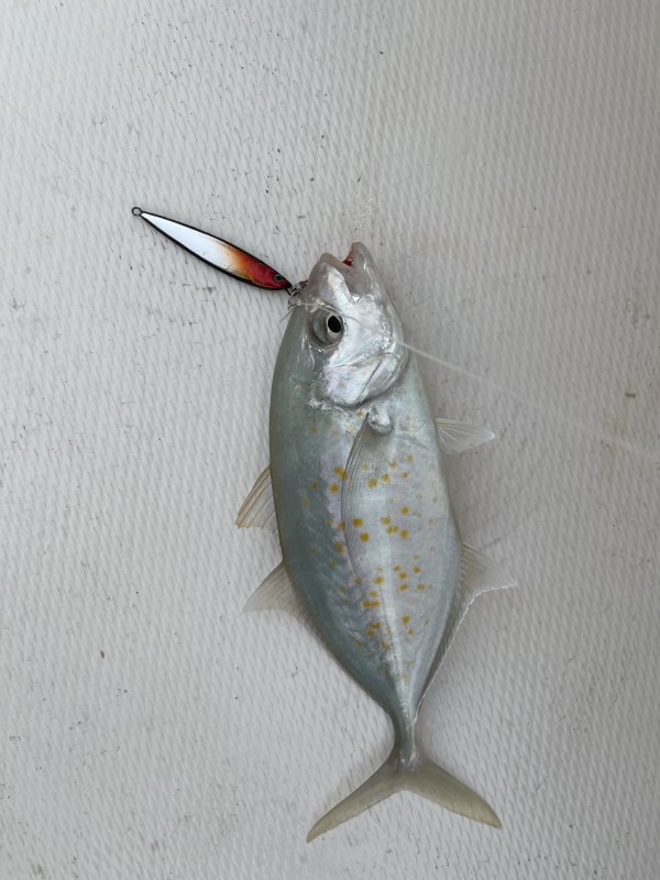 Ближняя локация молчала, ушли на 20 км. На равном дне с 14–15 м шли Yellow Spot Trevally на самодур и пилькер 18–22 г, попадалась мелкая барракуда. На живца по крупной — только обкусы, ветер усилился, вернулись к Марине.
