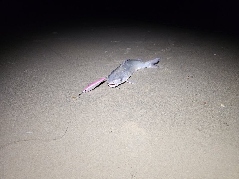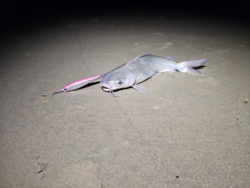 Ждал темноты на песчаной косе, пришёл полный штиль и тучи насекомых, ушёл на пляж. На быстротонущий стик — кэтфиш около килограмма, через пару минут забагрил морскую змею. Подойти нельзя, жалко приманку, но сама отцепилась и ушла. После такого ещё покидал поппер и свернулся.