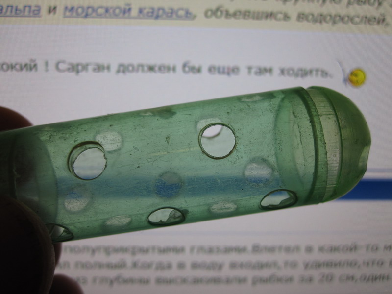 Стайки саргана ходили по мелководью. Пробовал «сицилийскую» схему: панировка в кормушке и десяток опарышей на крючок. То сухари высыпались в полёте, то не вымывались совсем.