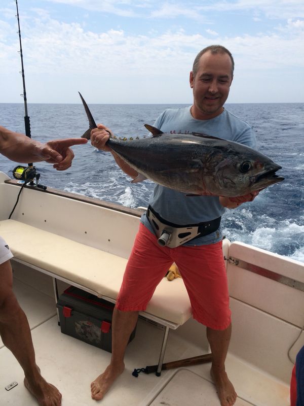Сначала озеро Banyoles: первый опыт по бассу на попперы, воблеры и железо, рыба до килограмма, на сковороду выбрали немного. Потом троллинг в море на 10-метровом катере: два тунеца на 18 и 39 кг, дельфины шли бортом. Команда довольна, рыбалка удалась.