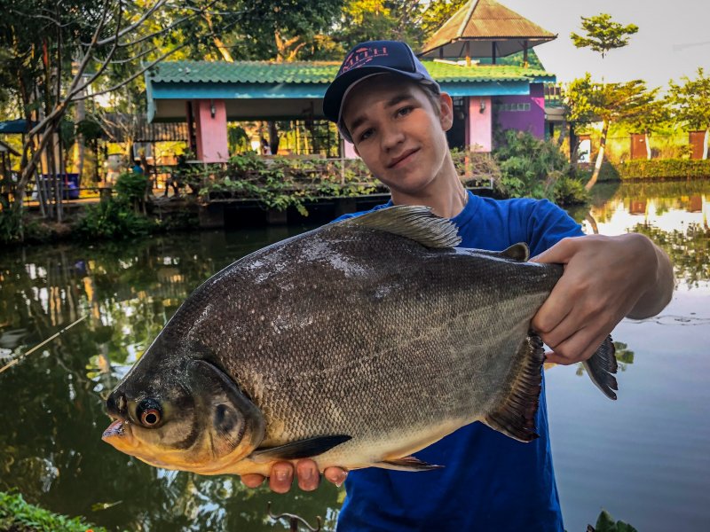 Две недели в Тае пролетели, рыбалка вышла одна и та не морская, а на платнике. Ловил поплавком под противоположный берег, паузы, медленная проводка, поклёвки то на паузах, то в ходу. Сом то сверху хватал, то в толще, промахов тьма, десяток контактов — две реализации. Хотел «паку-пиранью», грузился со дна и на хлеб, дождался, ушёл поплавок, рыба сильная, 5 минут вваливаешь и улыбаешься. Под конец снова по сому — шесть поклёвок, ноль подсечек. Ну и ладно, кроме самой рыбалки глаз радовали виды, морская тема в Паттайе в этот раз мимо.
