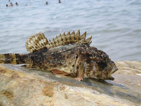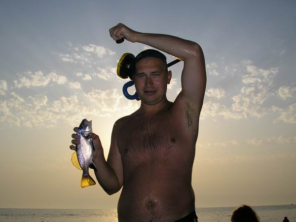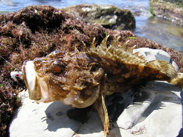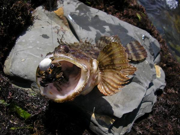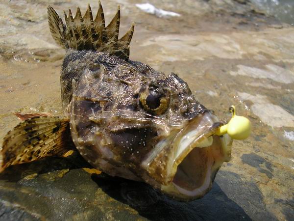 Август 2006, высокий берег. Оснастка простая, на крючке маленький краб. Скорпены шли, на твистер тоже клевало. Морского конька вытащил руками, горбыля единственного съели, остальное оставил в кадре.