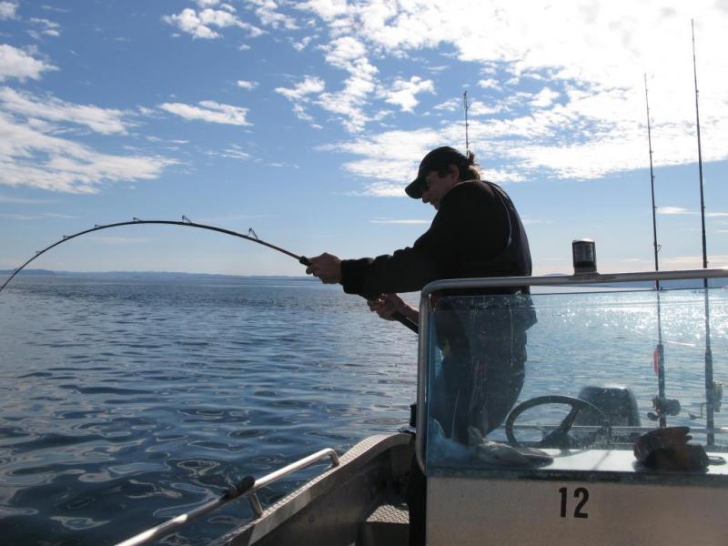 Тихая база, до моря близко. Макрель держалась у островков, детям зашла. «Крокодил» взялся на 160 м: половина сайды на двухкрючковой снасточке 12/0, груз около 650 г. Дал стравить, подождал полминуты, потом подсечка и долгий подъём.