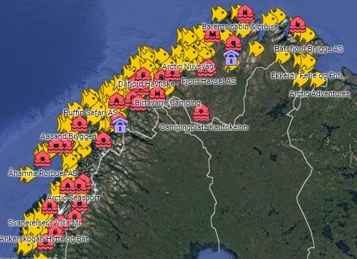 Собрал карту: рыболовные базы, кемпинги, владельцы коттеджей, есть поиск. Баз больше 300, буду дополнять и редактировать. Для рыбалки по Норвегии это удобно.