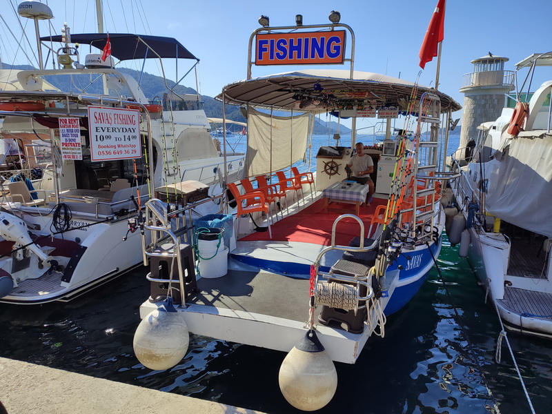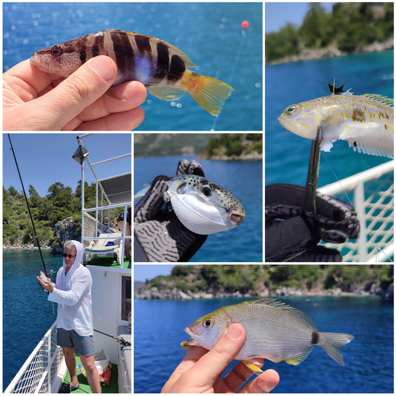 С товарищем прошли три точки 30, 40 и 50 м у Ичмелера, донка на креветку. За пять часов набилось ведёрко примерно 7 кг: караси, «öylesi», по мелочи баллон, желтохвостая барракуда, конгер. На свет у борта подошёл планктон, макрель охотилась и дважды перекусывала тонкую леску на самодуре. Стоило 80$ за двоих. В порту Мармариса такие же выходы, но тесно. На прогулке по Эгейским островам кидал на остановках: глубины 3-15 м, видимость космос, живности мало, черепахи пугливые