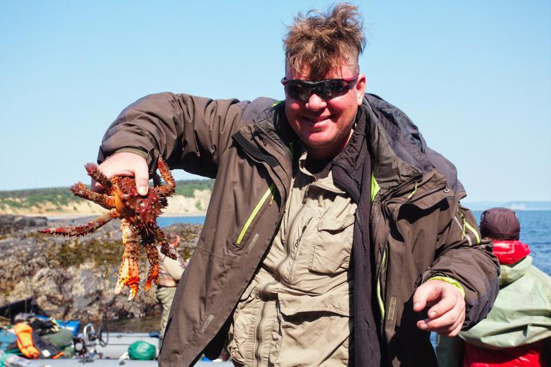 Команда из Сибири оторвалась по лососю, на спиннинг и на острогу. Крабы шли, морскую капусту готовили каждый день. Один раз попробовали миртензию, не всем зашла. Стол был богатый, настроение тоже