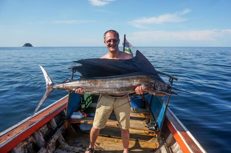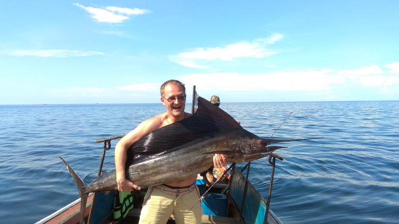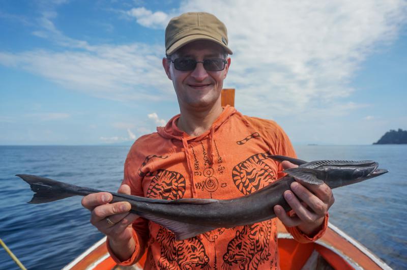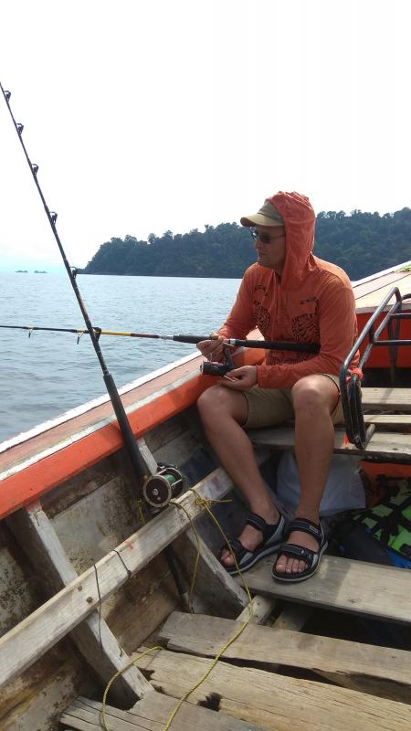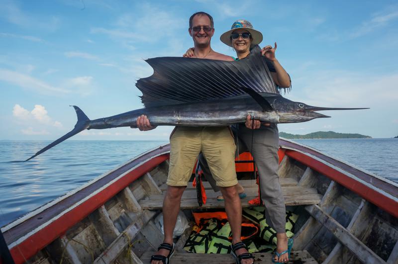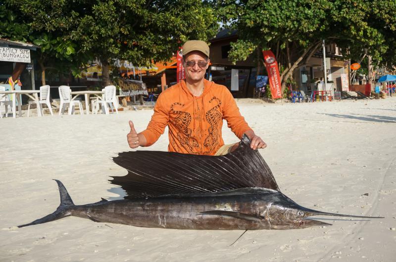 Перед выездом перечитал отчёт ua9jms, помог с планом, спасибо. Записались заранее, лодки уходят в 10 и возвращаются в 17. Взяли курс на северную оконечность Ко Аданг, живец был готов. Через 15 минут визг фрикциона у кэпа, свечи и сход, рядом у соседей тоже бой. Дальше пауза, дуплет без реализации, живца срезали в полоску. К 15 часам снова сработки, один посильнее, второй пустой. Вышел красавец, свечи у борта, аккуратно тянули минут 25. Завели и отпустили, по словам кэпа около 20 кг, парусник у них зовётся «марлин». Рыбу отдали в Family BBQ, вечером сделали ужин из нашего трофея, впечатления хватило надолго