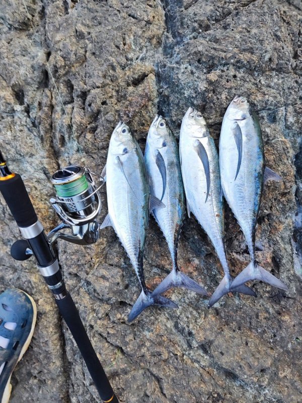Стоял февраль весь на острове. Жара давила — ловля строго в сумерках и перед рассветом. Ханкены шли лучше всего, иногда по 3–6 за утро. Помоны до 2 кг проскакивали нерегулярно, ночью заходил крупный минноу 140–150, днём металл. Лихия отмечалась на свету, самая крупная у меня 3+. Пару раз что-то сожрало рыбу на вываживании, похоже на баракуду. Сарган вечно пристаёт. Народ на камнях прибавился, придётся искать новые тропы