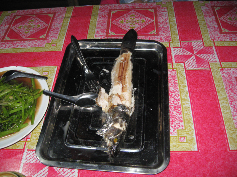 В первый день удалось обнаружить несколько кипящих котлов окуня, но порадовать нас поклевкой окунь не захотел. Котлы распадались при приближении. Перспективные для змееголова места, вроде бы обнадежили выходами хищника на поппер, но мазал он безбожно и подержать его в руках не удалось. Тайский «егерь» несколько раз погружался с ружьем в воду, подтвердил наличие крупной рыбы, но подстрелить не удалось.
