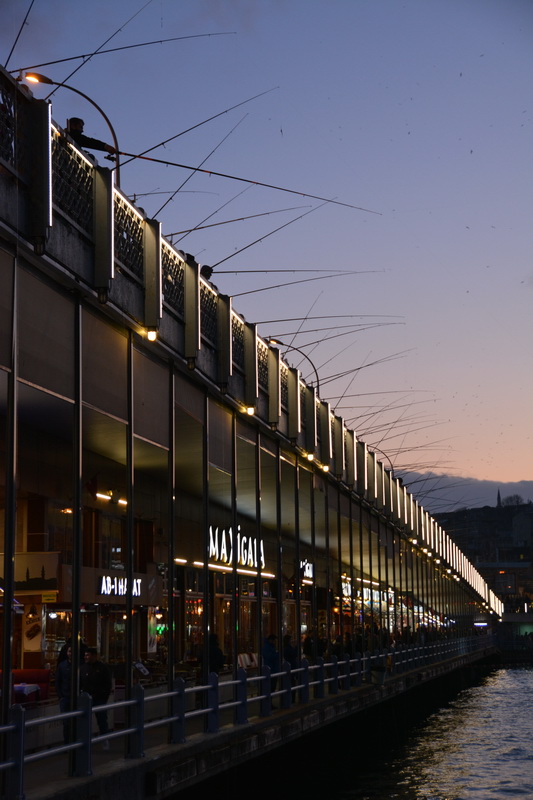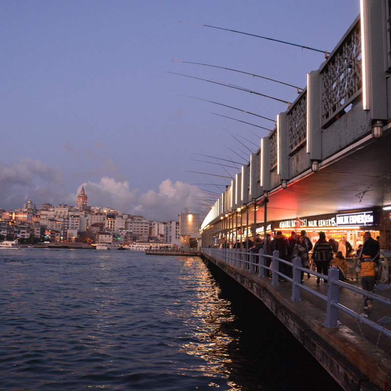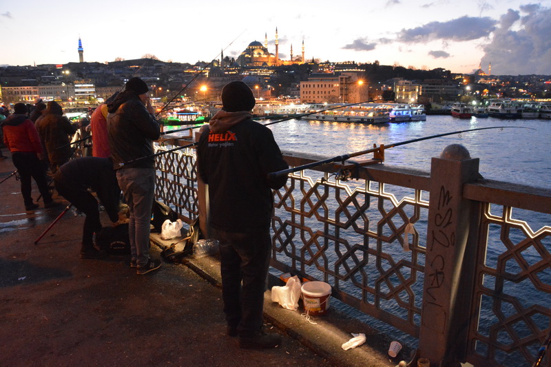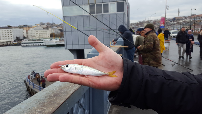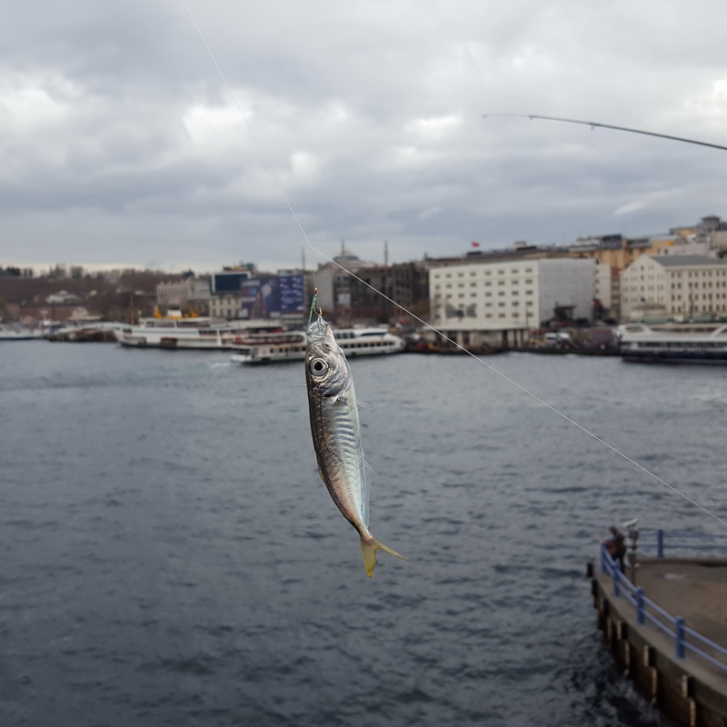 Ощущение, что весь Стамбул тут ловит. Ставрида — основная, кефаль по краям. Насадка у многих хамса или креветка, а у меня лучше шло на голый крючок с зелёной мушкой. Всё для ловли продают прямо на мосту и к северу от него, магазинов много