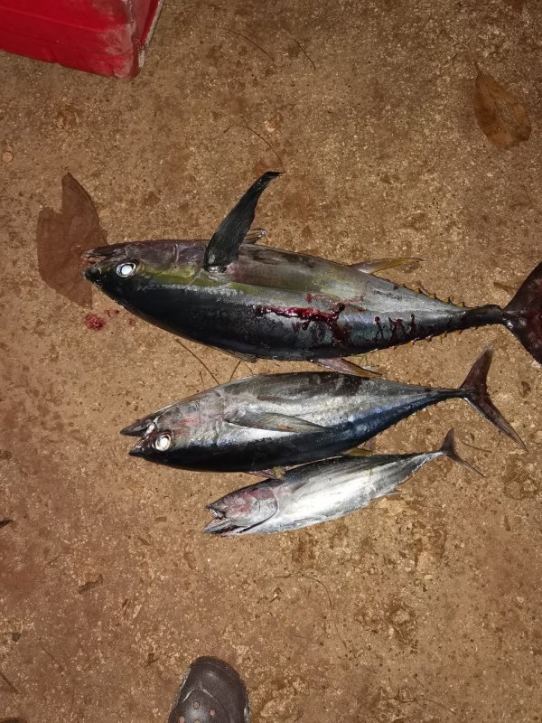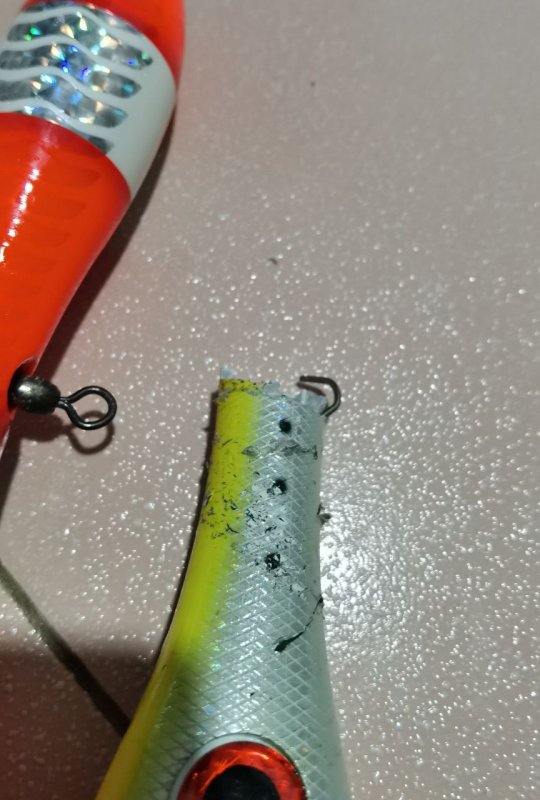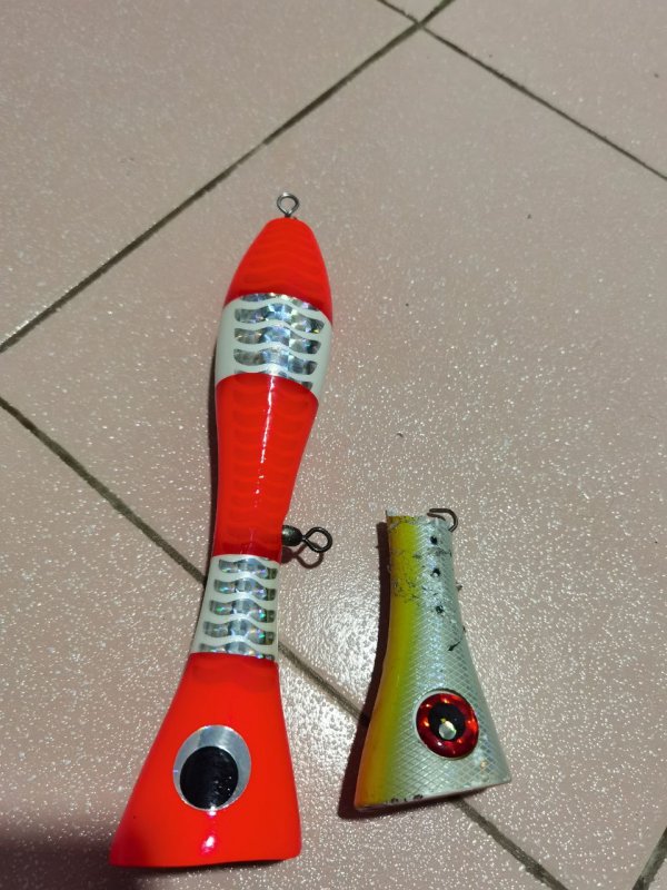 Решили убрать попперы в ящик и упереться в троллинг. Четыре снасти, на двух — «кальмары» топватеры, на двух — воблеры 140 и 210 мм с заглублением 4 и 12 м. Глубоководный срезало мгновенно, даже титан не спас, неприятно. Днём взяли бонито и желтоперого на 8 кг с «кальмара». К вечеру котлы ожили, перешли на поппер, сработало: один на 24, ещё пара сходов. Финал странный: паровоз 40+, две минуты тяги и тишина. Вынул поппер — один огрызок, акула отметилась. Оставлю, сделаю брелок, чтоб не забыть этот день ))