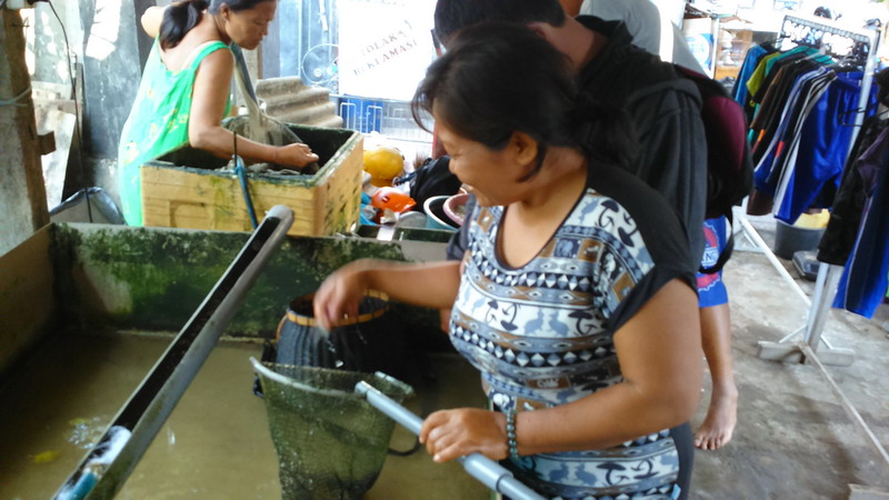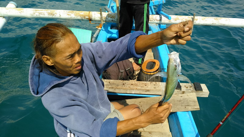 Утром океан встал волной, и лодочник сразу отказался везти на баркас. Пришлось быстро менять план: созвонились с тетушкой, которая торгует живой креветкой, взяли udang за 50000 рупий и ещё на 100000 в час договорились по лодке. У берега хищник гонял малька, и идея половить там казалась правильной, но местные упёрлись, что надо идти на большую воду.