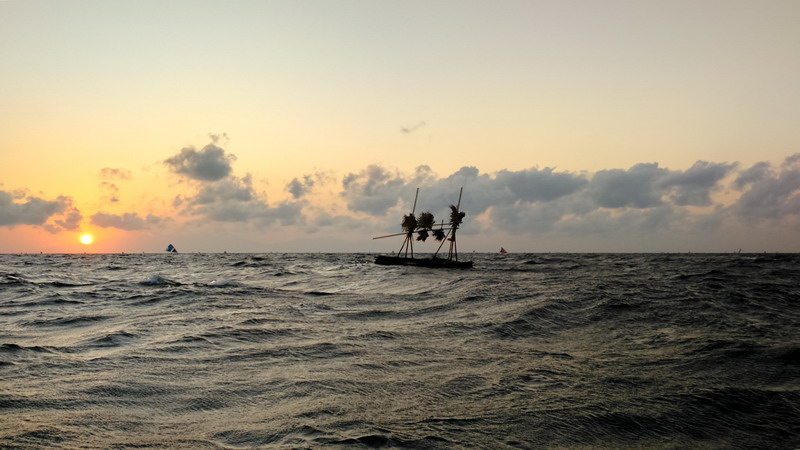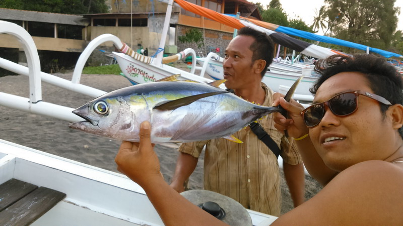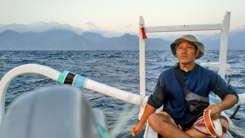 После дня со снорклингом и наблюдением за местными решил не идти в стандартные 600000 рупий за катание вдоль берега и предложил простую схему: 400000 за море и ещё столько же бонусом, если рыба будет больше двух кило. На рассвете вышли в сторону Gili Selang, потом дошли до бамбукового плота примерно в шести километрах от берега. Вокруг уже крутились десятки лодок, потому что шёл сезон mahi-mahi и все гоняли по волне половинку мелкой макрели.