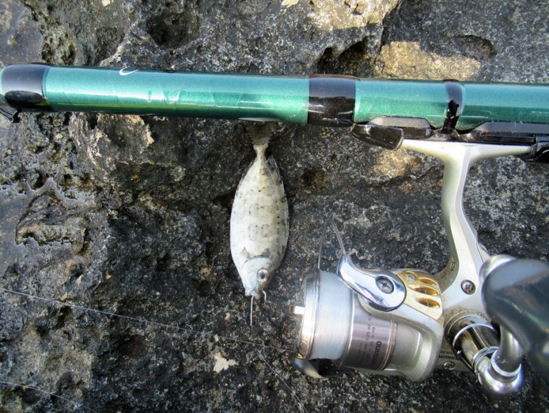 Во вторник проспал и вышел к воде только к шести, да ещё после вечерних посиделок. Сначала решил просто посидеть с поплавком: travel-удилка 3.60, леска 0.2, поводок 0.16, поплавок 6 грамм и обычная булка из магазина. Местные так ловят постоянно. У меня в то утро толком ничего крупного не подошло, попалась одна ладошечная рыба, но понять место и привычки береговой мелочи было полезно.