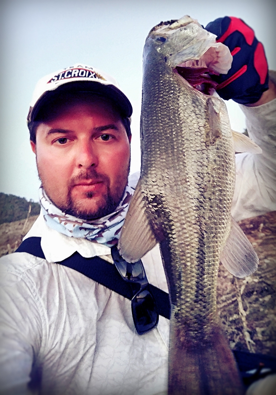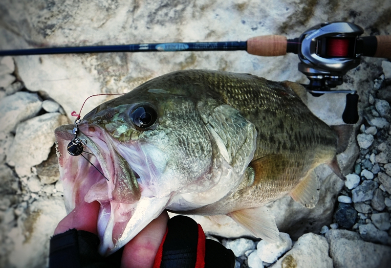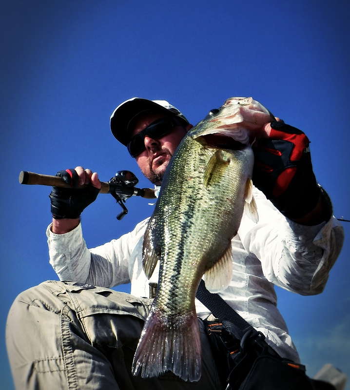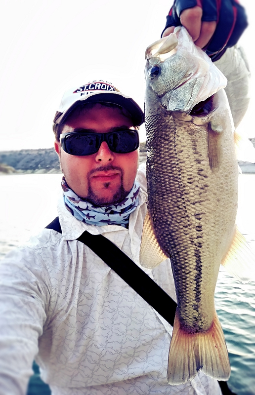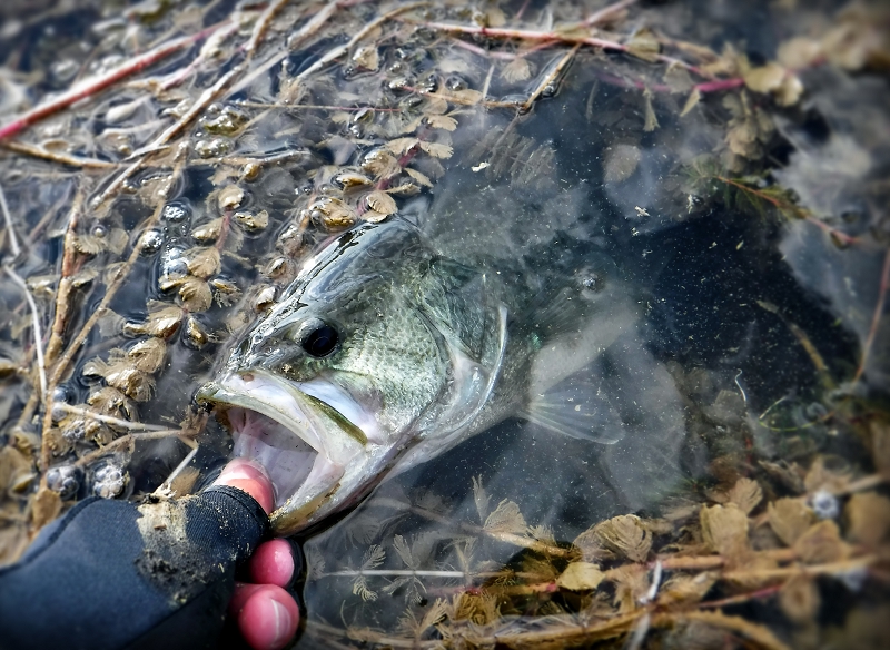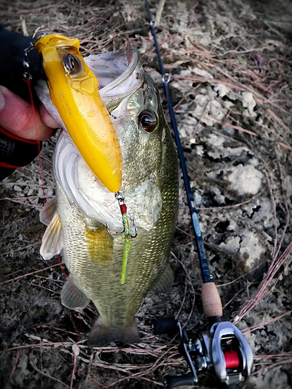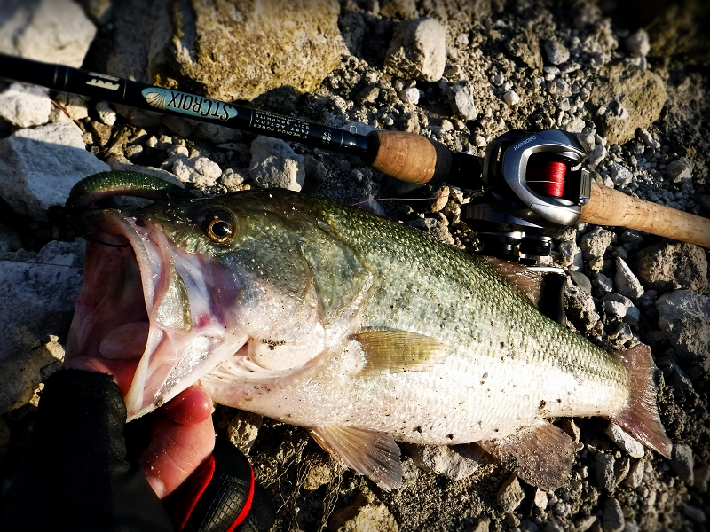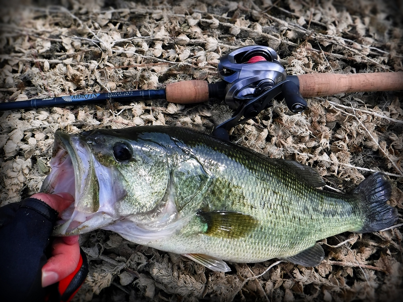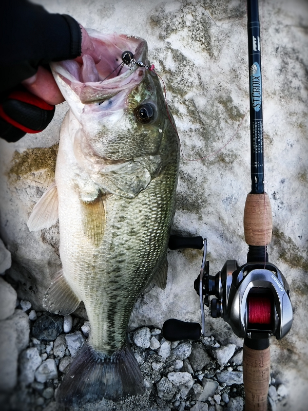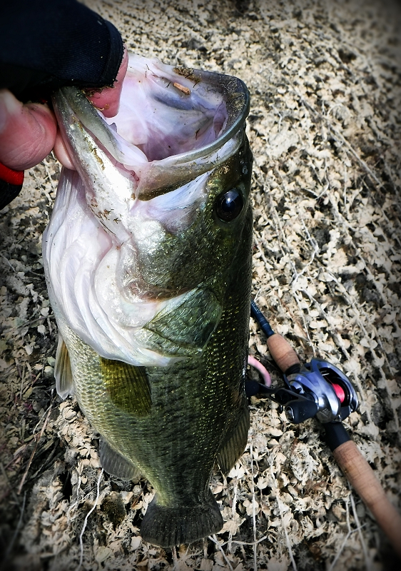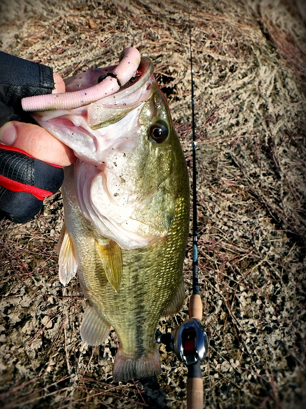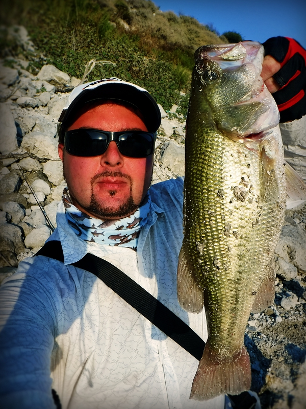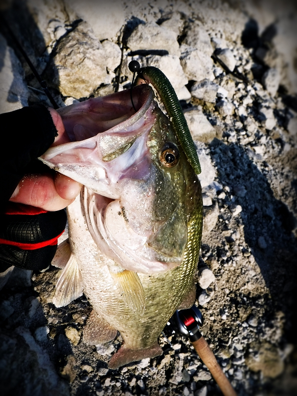 По этой поездке у меня вышел длинный ходовой день вокруг водохранилища. Сначала просто смотрел воду и берег, потом пошли первые поклёвки по мелкому бассу, а уже дальше нашёлся и более внятный экземпляр. Работали спокойный обход, нормальный контроль приманки и готовность много перемещаться, а не стоять в одном кармане до темноты.