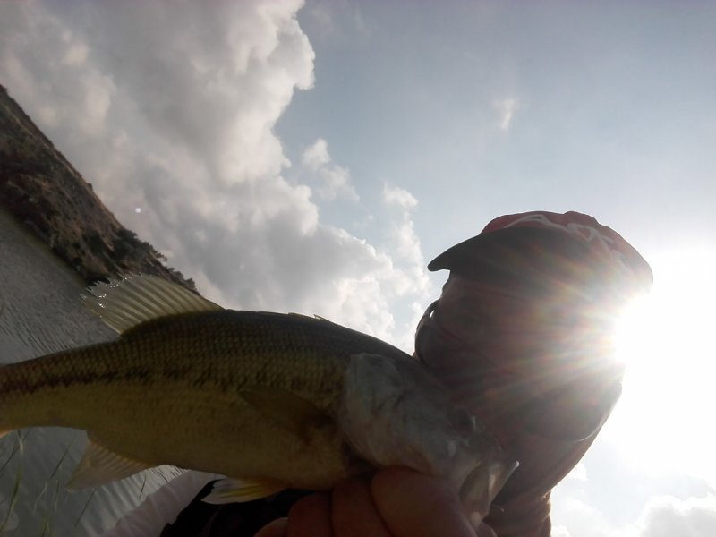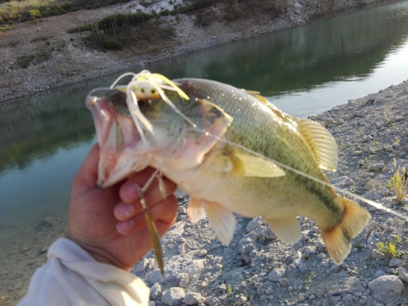 Здесь вода уже совсем живая: крутой каменистый склон, прозрачный берег и басс, который берет почти под ногами. По фото видно и сам рельеф, и рабочий воблер, и то, что подойти к воде было не так просто. Это не прогулочный берег, а место, где сначала надо аккуратно спуститься, а уже потом думать о проводке.
