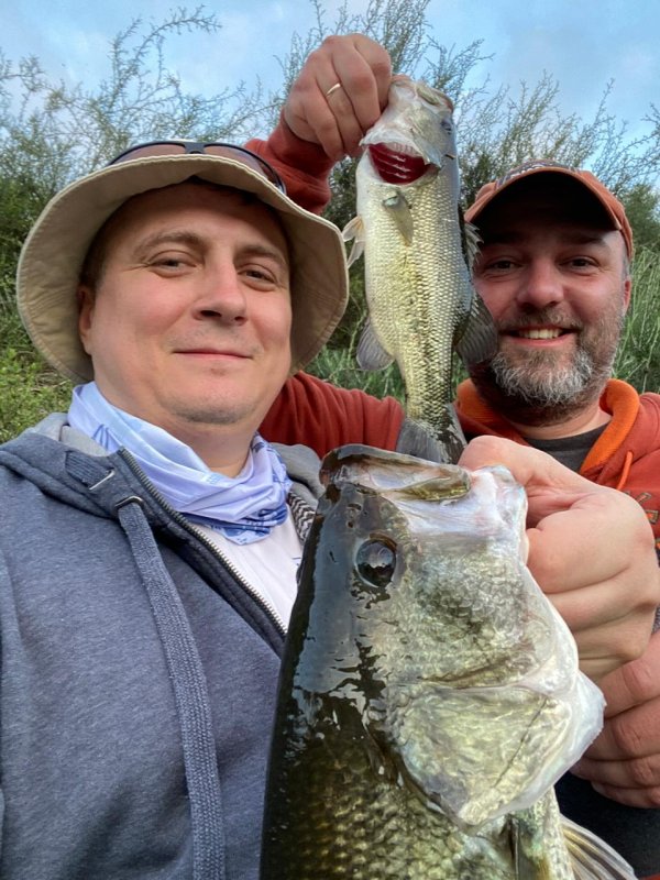 Этот выезд хорош тем, что тут видна не одна случайная рыба, а нормальная серия по разным людям и точкам. Погода неидеальная, по дороге тоже виден обычный дорожный быт, но по факту день рабочий: басс ловился, размер разный, и каждый нашёл свою рыбу.