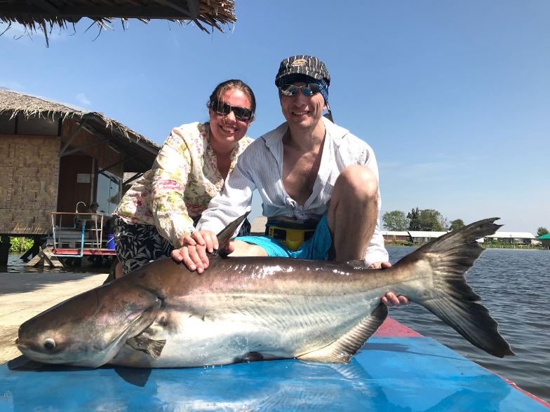 Эта карточка получилась почти полностью визуальной: по тексту там мало толка, зато по фото хорошо видно, что речь идёт не о прогулочной рыбалке, а о тяжёлом тайском платнике с крупным сомом. В кадре сразу читается и размер рыбы, и то, что без нормального комплекта сюда лучше не лезть. Такие выезды в Паттайе обычно не про тонкую игру приманкой, а про запас по снасти, терпение и аккуратное вываживание у самой кромки воды.