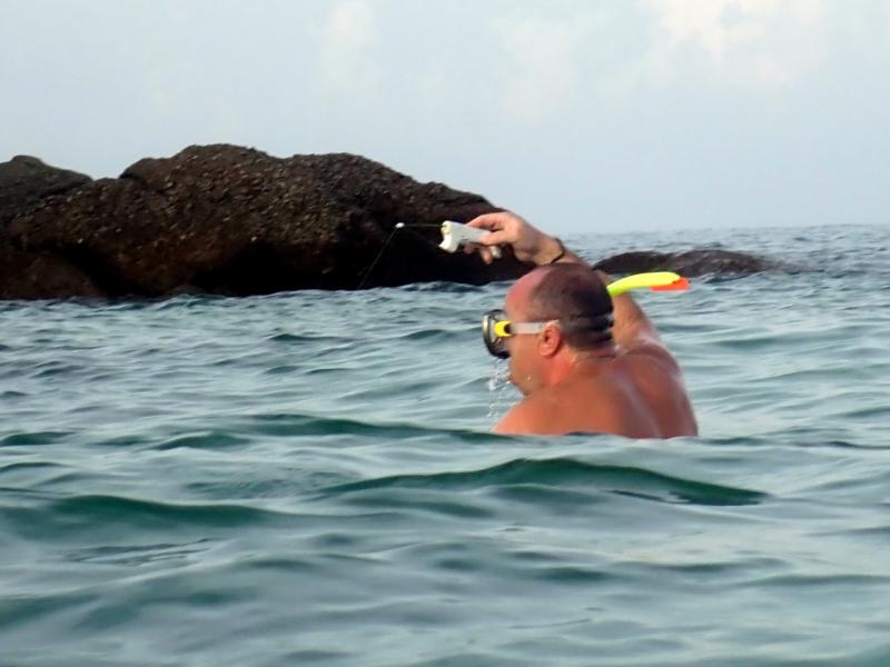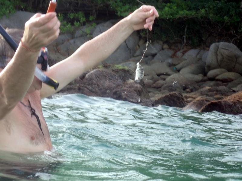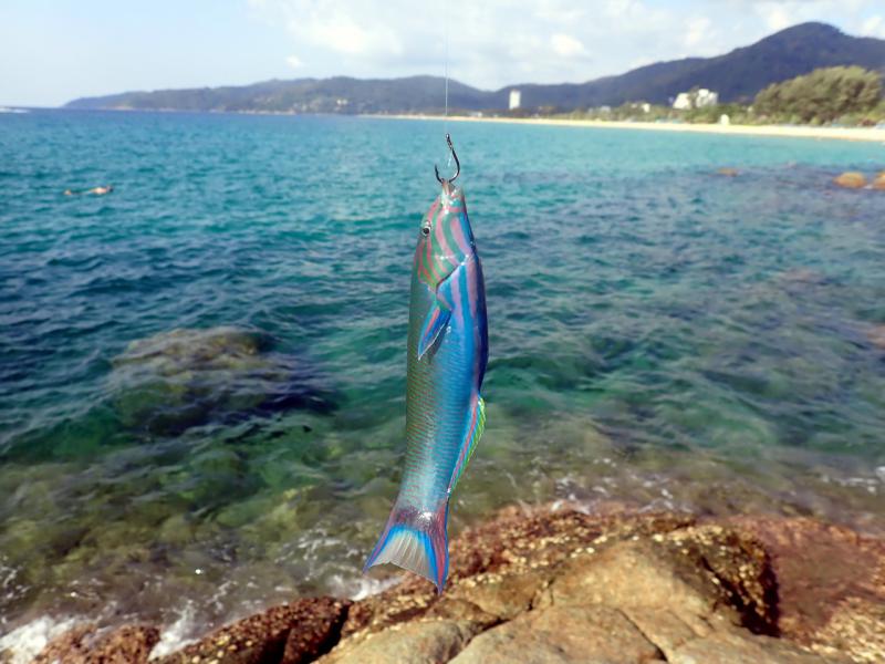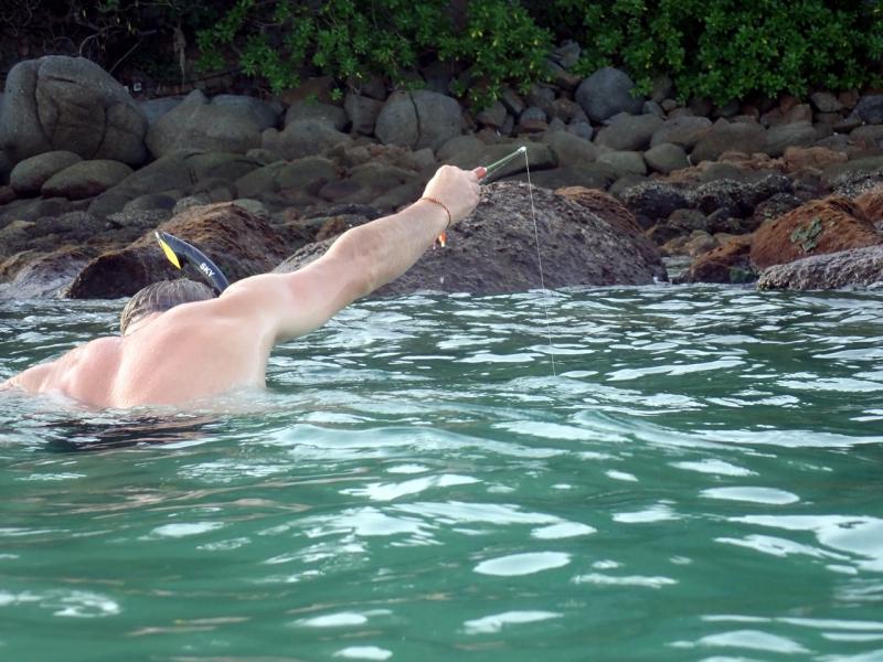 С моря на Пхукете в этот раз толку почти не было. С камней взял одну мелкую рыбёшку на кусочек креветки, местные показали свои приманки под каракатицу, я потом ещё нырял с маской, собирал всякую насадку и пробовал железо — по нулям. Под водой рыбы много, а с берега нормального шанса она так и не дала.