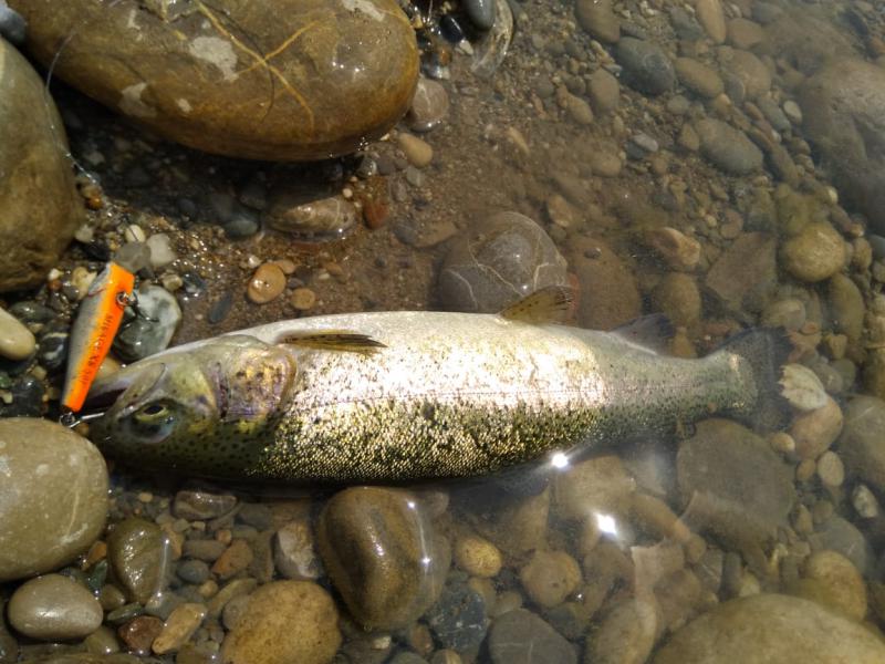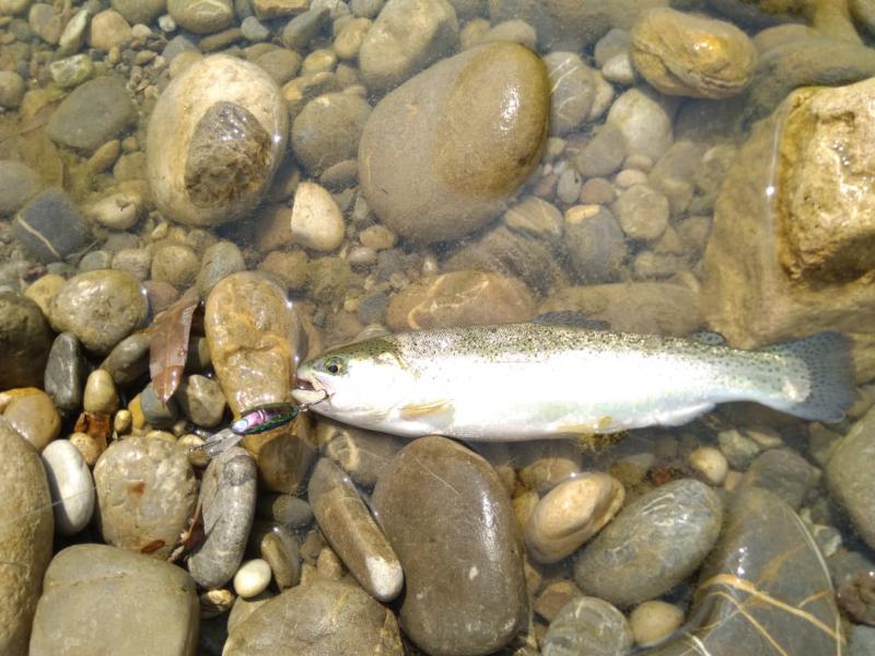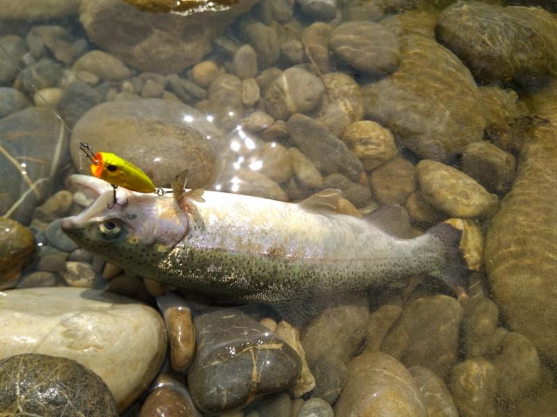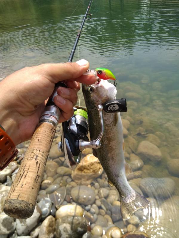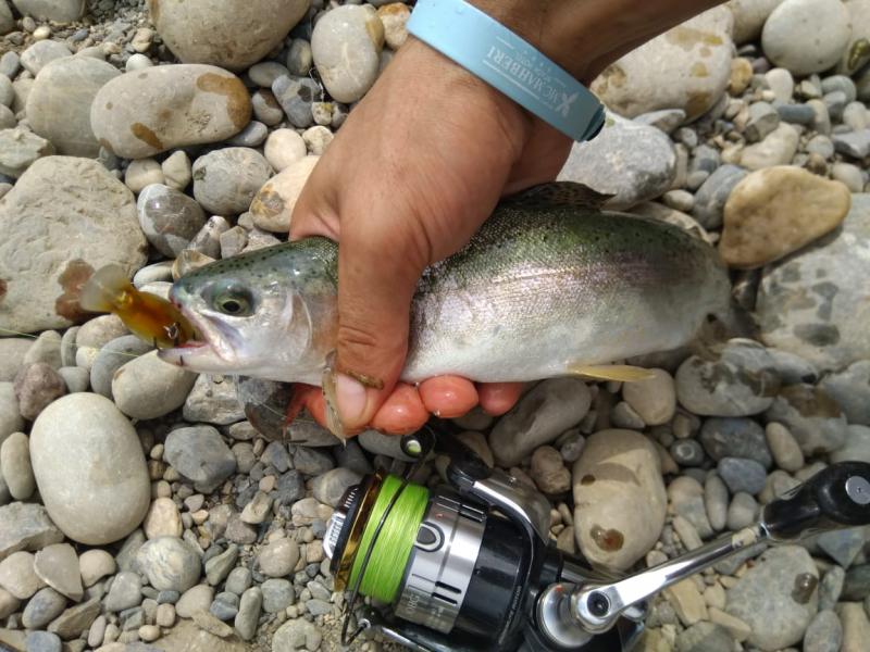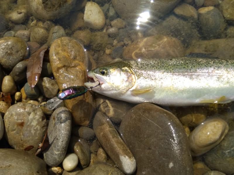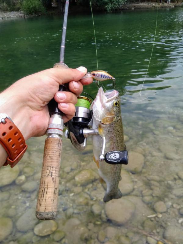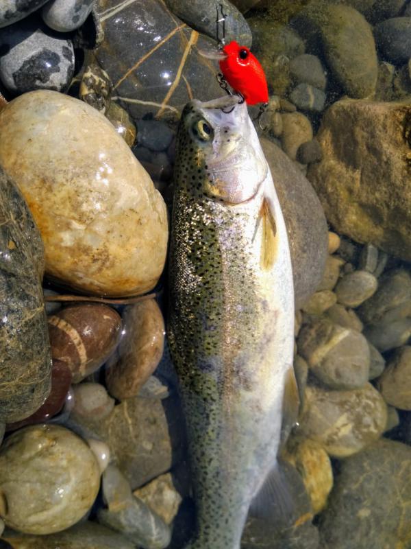 Выручил второй участок выше по течению. Там парень по имени Алан, услышав, что я притопал от моря просто порыбачить, быстро договорился, чтобы меня пустили на спиннинг по обычному прайсу в десять долларов. Форель в пруду стояла граммов по 300-500, клевала азартно, на уокеры, попперы и всякую пластиковую мелочь, а реже и на колебло 1.8-4 грамма.