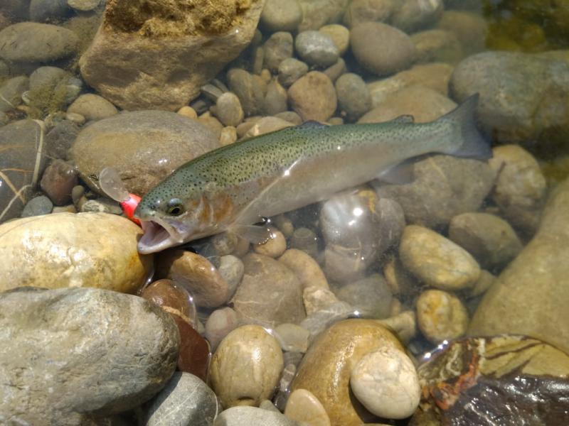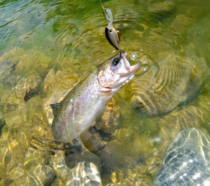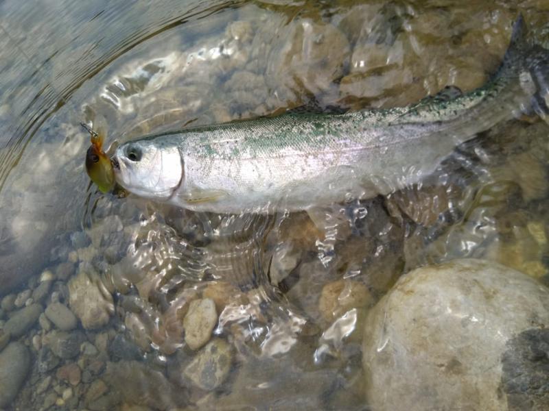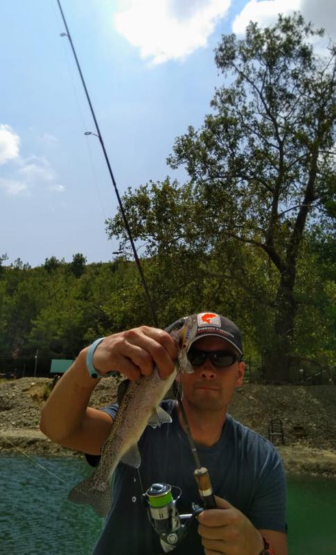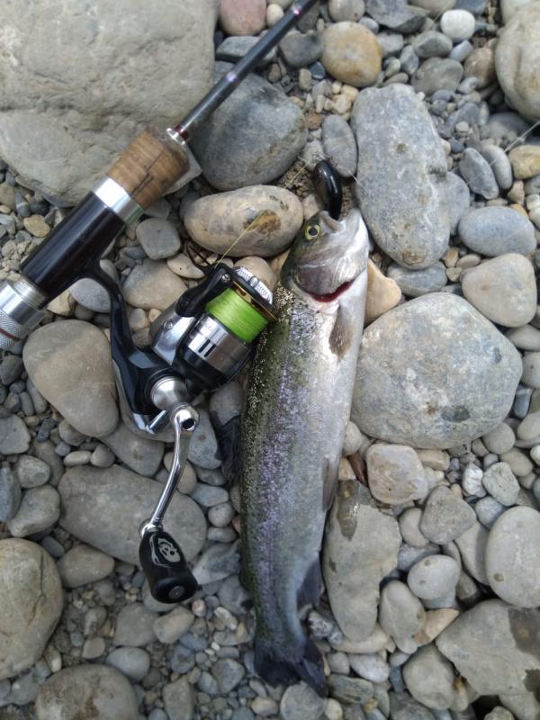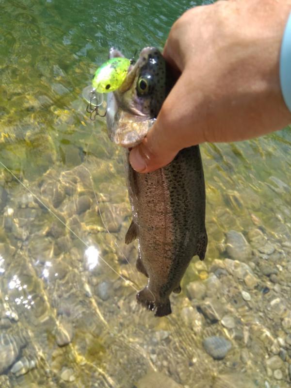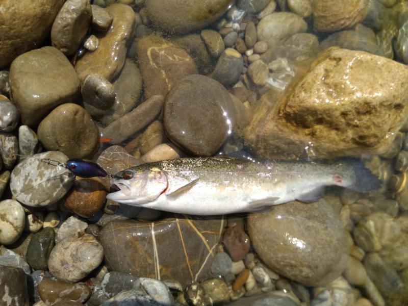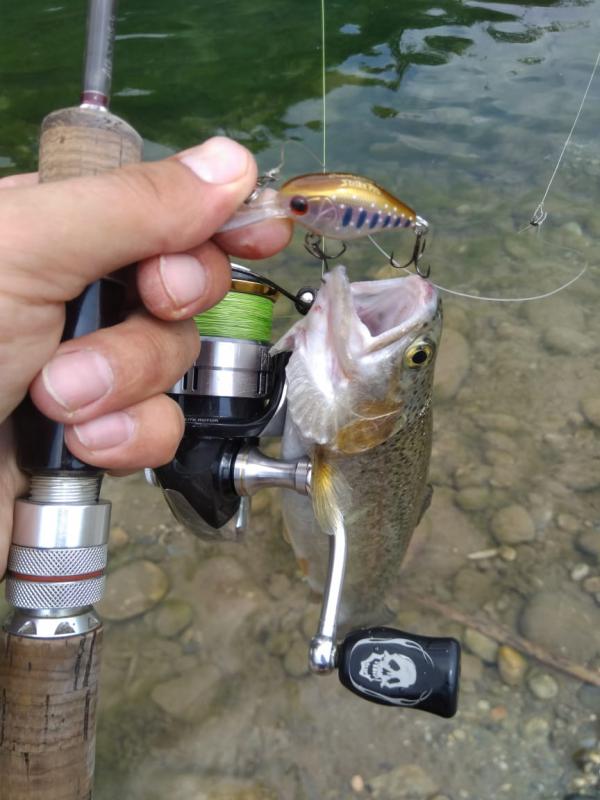 Выручил второй участок выше по течению. Там парень по имени Алан, услышав, что я притопал от моря просто порыбачить, быстро договорился, чтобы меня пустили на спиннинг по обычному прайсу в десять долларов. Форель в пруду стояла граммов по 300-500, клевала азартно, на уокеры, попперы и всякую пластиковую мелочь, а реже и на колебло 1.8-4 грамма.