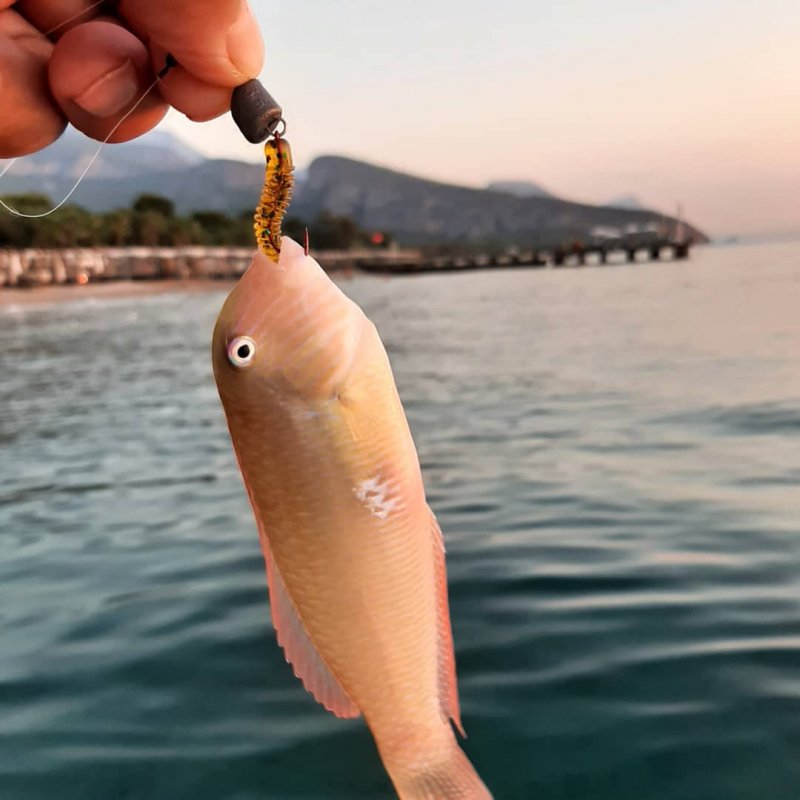 В Анталии попал в тот период, когда море уже прогрелось слишком сильно и рыба отошла глубже. Основные попытки были с пляжа у отеля и с камней у тоннеля. На крупное железо время от времени отзывалась мелкая барракуда, а внизу держались баллоны: рабочий вес по ним был 400-600 грамм, один попался примерно на кило, ещё один уже около трёшки. Пробовал и микруху 1,5 г — поклёвки были, но засечь нормально почти не удавалось.