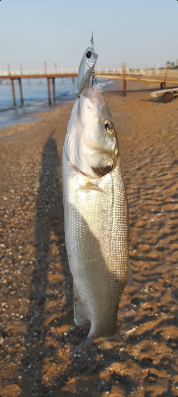 С pocopoco я в этом поселке ловил унцовым спиннингом со шнуром 0,8 PE, и дальний заброс для сибаса оказался не нужен. Рыба около килограмма парковалась на такой снасти легко, а сам поппер работал настолько уверенно, что автор прямо пишет - сибаса он косит. Но у этой эффективности была неприятная сторона. Леврек довольно часто заглатывал приманку глубоко, почти до жабер, как говорится в шахту. После такого поппер трудно доставать, и не каждую рыбу уже можно нормально отпустить. Поэтому удачный вариант на фото как раз тот, где зацеп получился безопаснее. Кадры с поппером в шахте автор показывать не стал. Окно по сибасу в этом поселке оказалось очень жестким. Днем и вечером рыба не клевала, половить получалось только утром после восхода солнца. Накануне удалось взять 5 штук, сегодня только 2, потому что времени именно на сибаса было мало. Дальше началась попытка переключиться с понятного утреннего сибаса на более крупных рыб. На воблер монстры выходили, но не брали. Рыба отлично видела рыболова и почти сразу уходила, поэтому контакт оставался только зрительным. В качестве таких монстров сегодня были, предположительно, амберджек примерно на 3 кг и еще какая-то длинная быстрая колбаса длиной около метра или больше. Она сопровождала воблер, но есть его не стала. По виду это мог быть сарган или баракуда, хотя местные говорили, что баракуды здесь почти нет, а крупный сарган держится далеко от берега. Поэтому уверенно подписывать эту рыбу нельзя, в источнике она остается неопределенной. Еще местные рыболовы звали автора на утреннюю лодочную рыбалку за паламутом, причем бесплатно. Он не поехал, а они в итоге поймали примерно в 500 м от берега 6 штук за 2 часа, все до 1 кг. При этом желание попробовать крупную рыбу с берега осталось. Автор понимал, что катушкой Daiwa Tournament 2500 двадцатилетней давности, шнуром 0,8 PE и унцовым спиннингом вывести настоящего монстра или хорошего паламута будет проблематично, но именно это и хотелось проверить. Этот альбом поэтому не только про сибаса на поппер после восхода, а про границу снасти - когда рабочая приманка уже понятна, утренний леврек ловится, но взгляд все равно уходит к рыбе, которая выходит за воблером и пока не берет.