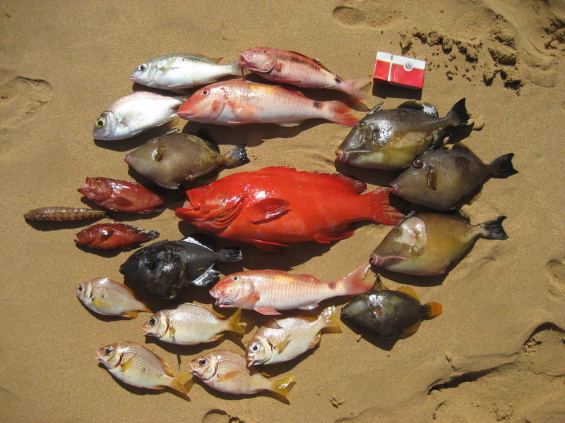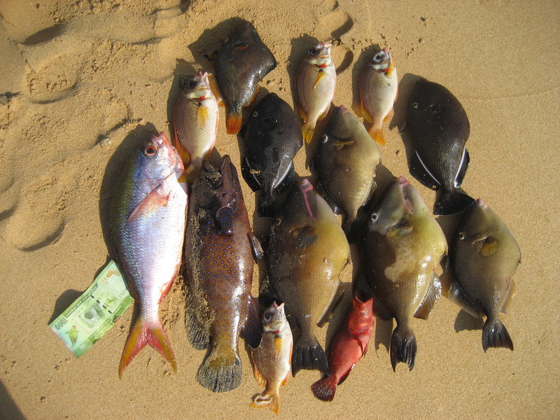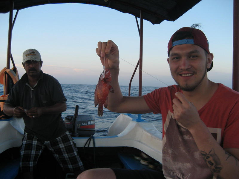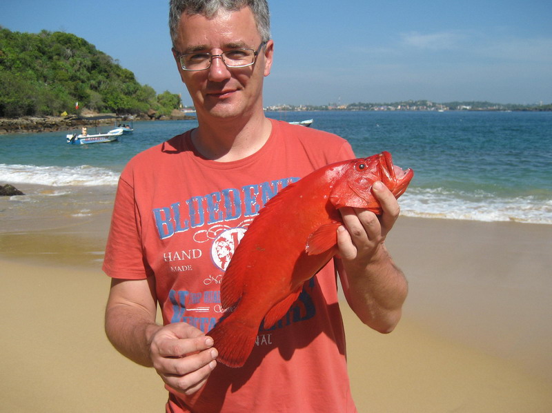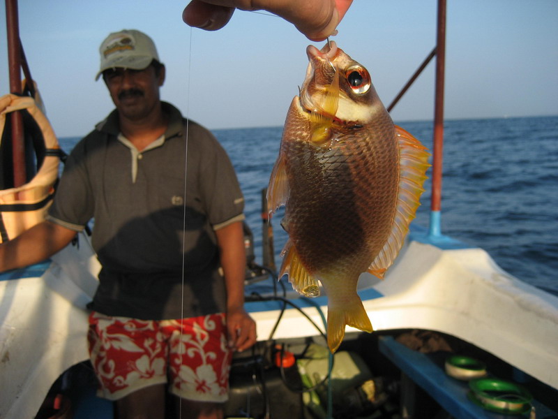 На Шри-Ланке я дважды выходил в море с рыбаком по имени Kimal, который заодно владел пляжем Jungle Beach и явно знал местную воду лучше любых навигаторов. Оба раза мы рыбачили утром с шести до девяти и оба раза он выводил лодку в одну и ту же точку, очень уверенно и без лишней суеты, так что сомнений в наработанном маршруте у меня не осталось. По деньгам первый выход стоил мне четыре тысячи рупий плюс чаевые помощнику, а второй уже восемь тысяч за двоих без помощника, потому что повторять старую цену Kimal не захотел. Вся эта логистика запомнилась, но куда важнее оказалась сама рабочая схема. Ловили на кальмара на глубине около тридцати метров. Леску толще или тоньше там, как мне показалось, выдумывать особого смысла не было, а во второй выход при небольшом течении шестьдесят граммов груза вполне справлялись. По местным меркам улов выглядел довольно скромно, но на уху и жареху рыбы оба раза хватило. Лучше всего у нас заходили спинороги, которые особенно понравились девчонкам на столе, а у меня главным трофеем того мини-цикла остался красный группер, самый крупный из лично пойманных мной на тот момент, чуть больше килограмма. Большую часть рыбы с фотографии я взял сам, потому что катушкой облавливал широкий радиус и хорошо чувствовал поклевки на тонком шнуре. На обратном пути мы еще ставили воблер Rapala, но троллингом в этот раз ничего не добрали. Зато сам выход запомнился не только рыбой, но и этой узкой колоритной весельной лодочкой, на которой местные утром добывают наживку у самого океана.