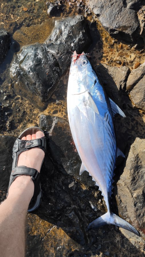 До этой вылазки у меня уже было февральское сообщение по месту, а теперь наконец получилось добраться туда лично. Погода встретила жестко. До субботы стоял ветер около десяти метров в секунду с порывами до пятнадцати, но терять время я не собирался и рано утром все равно убежал на берег хотя бы на полтора часа разведки. В этот раз я сознательно не тащил с собой воблеры. Взял только пилькеры, к тому же как раз под поездку немного обновил ими коробку. При таком сильном и почти боковом ветре даже ими бросать было непросто, но другого по-настоящему рабочего варианта в этих условиях я не видел. Первые поклевки начались почти сразу, но в основном были холостыми и происходили уже ближе к берегу. Тем не менее одну дежурную дудку я все-таки выдернул, просто чтобы не уйти совсем с нулем и чуть лучше почувствовать, что происходит в воде. Потом внимание переключилось на странный чаевник, который сначала выглядел вялым и висел где-то метрах в ста или ста пятидесяти от меня. Он медленно смещался в мою сторону, и я какое-то время не считал его чем-то особенным. Но в какой-то момент над головой резко рванула от берега стая чаек, и когда я снова посмотрел в ту сторону, чаевник уже ожил по-настоящему. Появились плески, а сам он оказался уже метрах в сорока от меня. Я как мог прицелился и кинул туда пилькер. Бросок вышел не идеальным, приманка легла чуть сбоку, но этого хватило. Пилькер еще только падал, когда в руку пришла мощная потяжка. Я подсек, и дальше началось именно то, ради чего все эти сложные морские выезды и нужны. Первые пять минут у меня просто свистел фрикцион и со шпули сходил шнур. Я толком не понимал, что там сидит, но уже боялся, выдержит ли моя лайтовая снасть. Потом рыба чуть успокоилась, и я начал понемногу отвоевывать дистанцию. Следующие несколько минут мы играли в полноценное перетягивание каната уже совсем недалеко от берега, примерно в пятнадцати метрах. Когда я наконец подтянул рыбу к парапету и смог рассмотреть ее, стало ясно, что это мой первый тунец. Еще немного возни на финише, и он оказался на берегу. По эмоциям этот момент перекрыл вообще весь тяжелый ветер, холостые поклевки и прежние сомнения. Ходить потом довольным до вечера действительно было очень легко. После короткой фотосессии я отпустил рыбу обратно в ее стихию, и именно это утро для меня стало той самой точкой, когда береговая морская рыбалка в Хургаде перестала быть просто экспериментом и стала настоящим пережитым опытом.