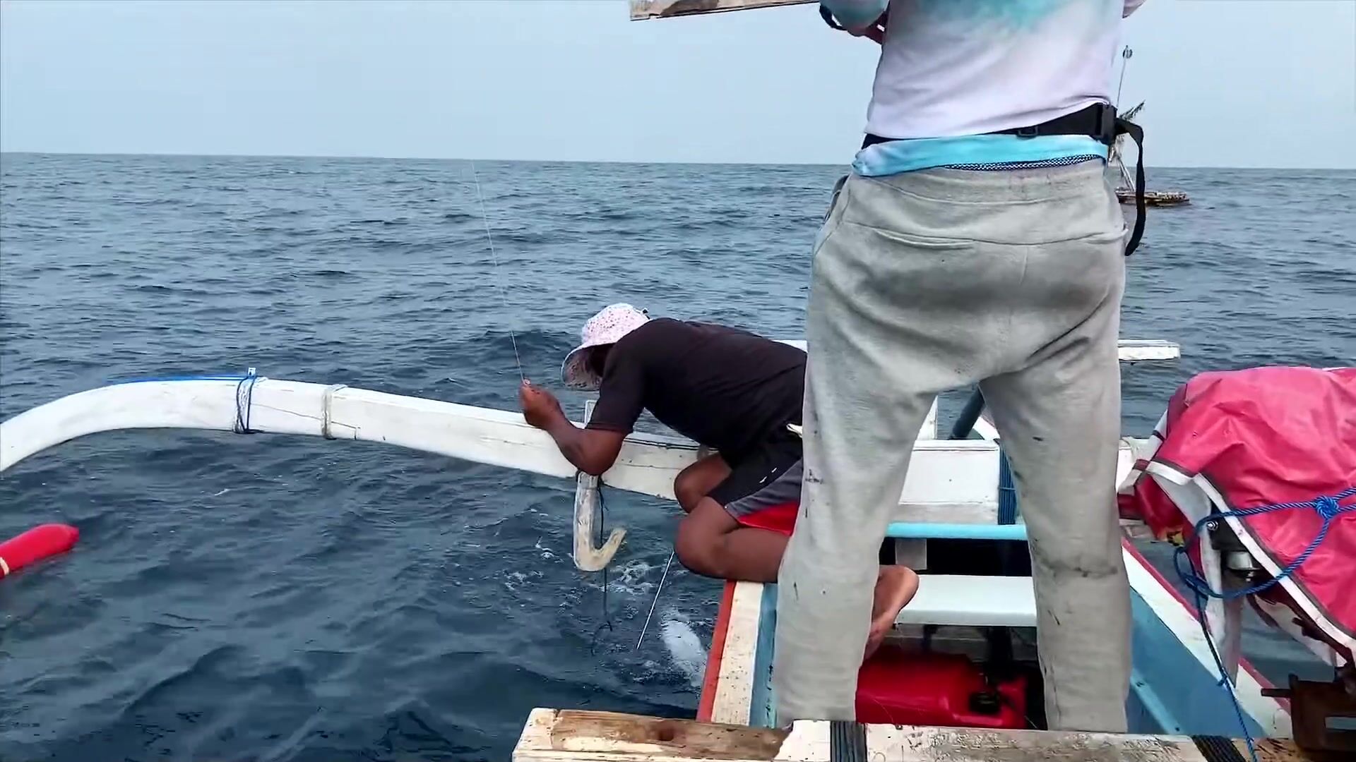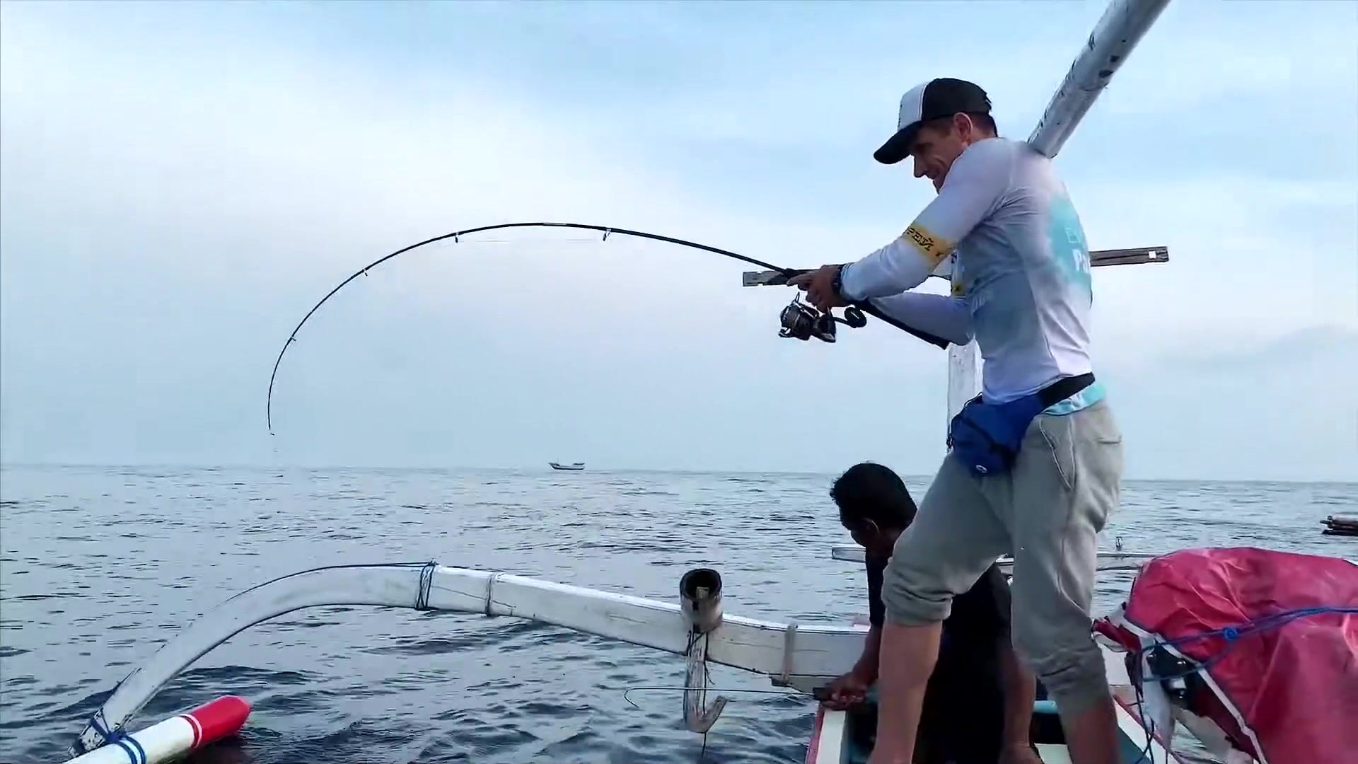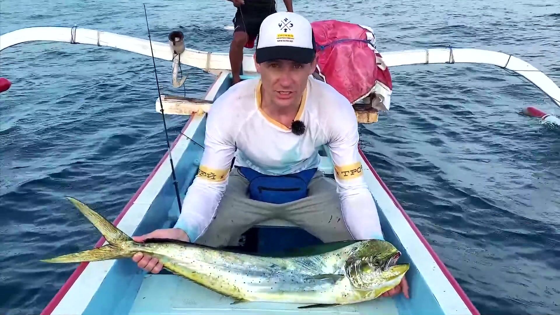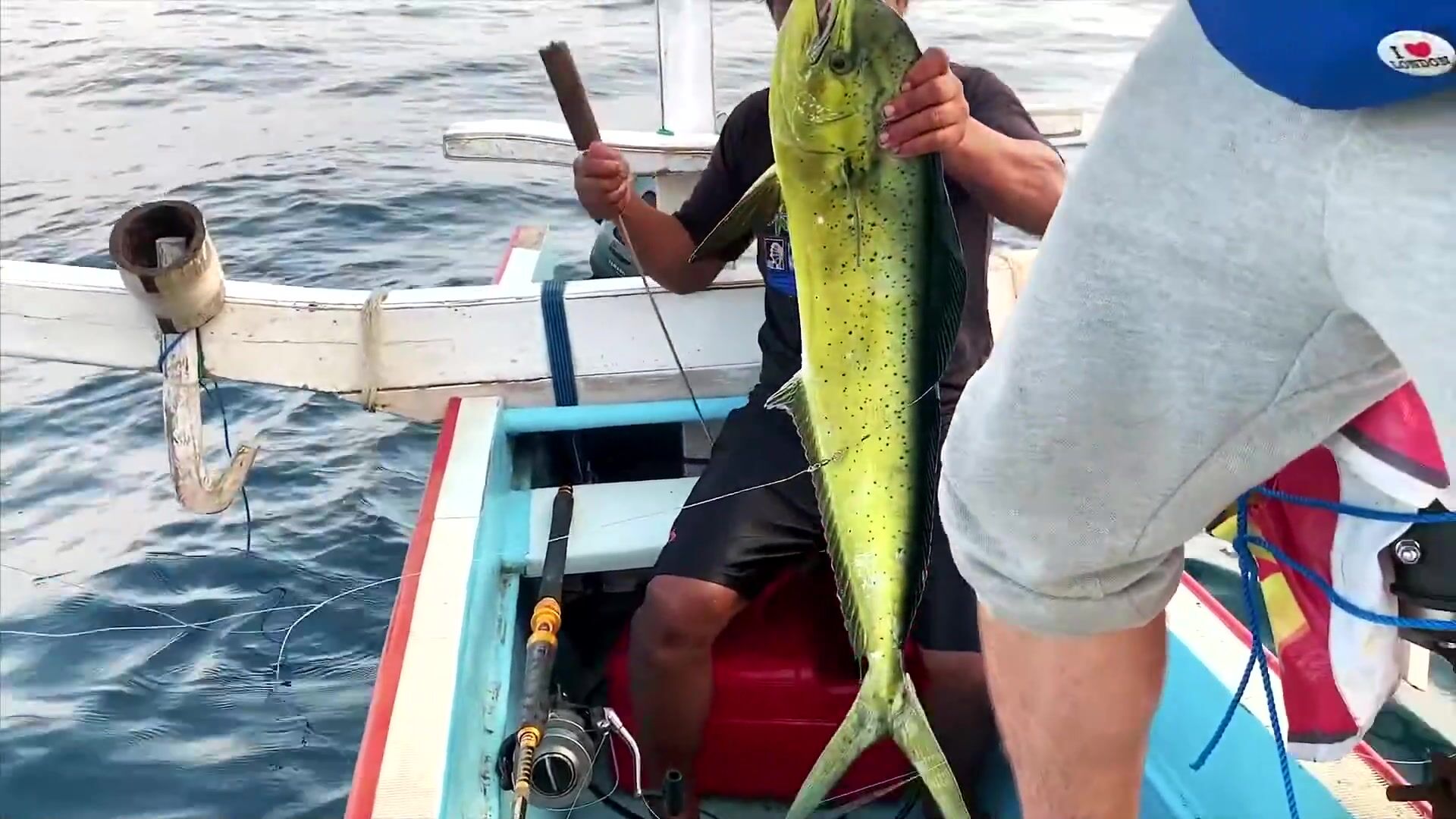 Перед выходом в море волны ещё приличные, но терпимо. И вдруг - дельфины! Целая стая, штук сто, может больше. Прыгают, свистят, аж сердце замирает. Красота невозможная. И вот буквально через полчаса - мощная поклёвка! Палка в дугу, катушка орёт, фрикцион визжит, я весь в адреналине. Махи-махи пошла в сторону, потом свеча из воды - и снова в глубину. Минут 10 боролись, вытащил! Первая моя на Бали, красавица золотистая, килограмма на четыре, не меньше.