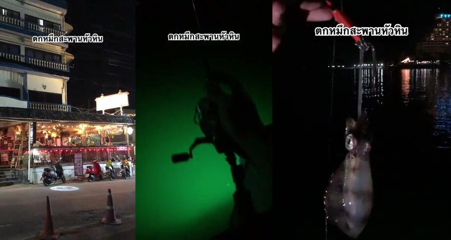 Ночная ловля кальмаров с моста Hua Hin огни над водой и мерцающие тени под лодками